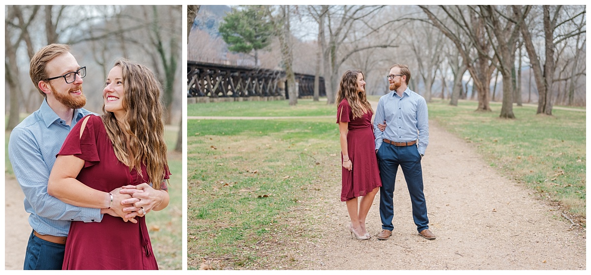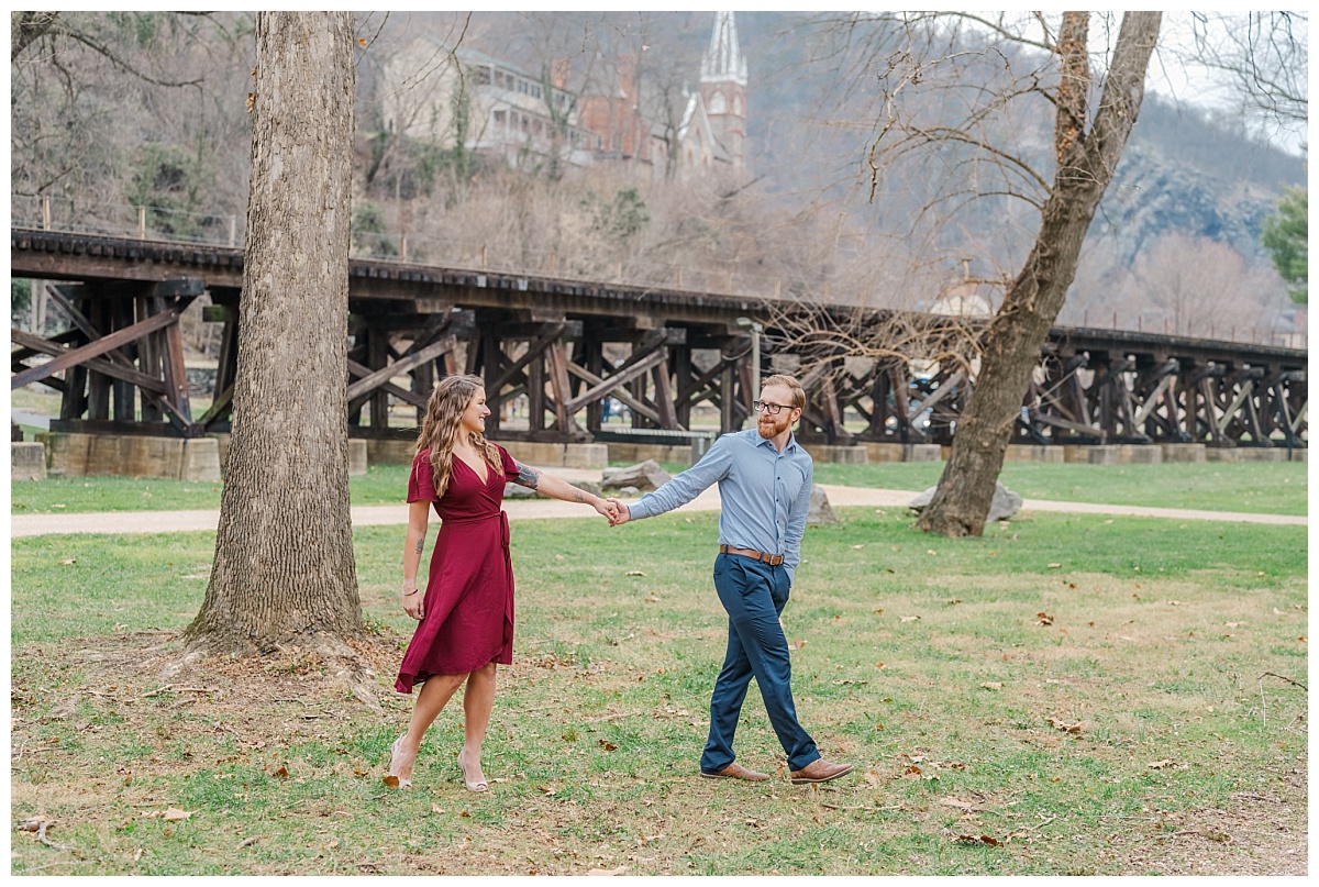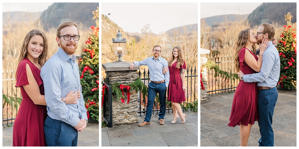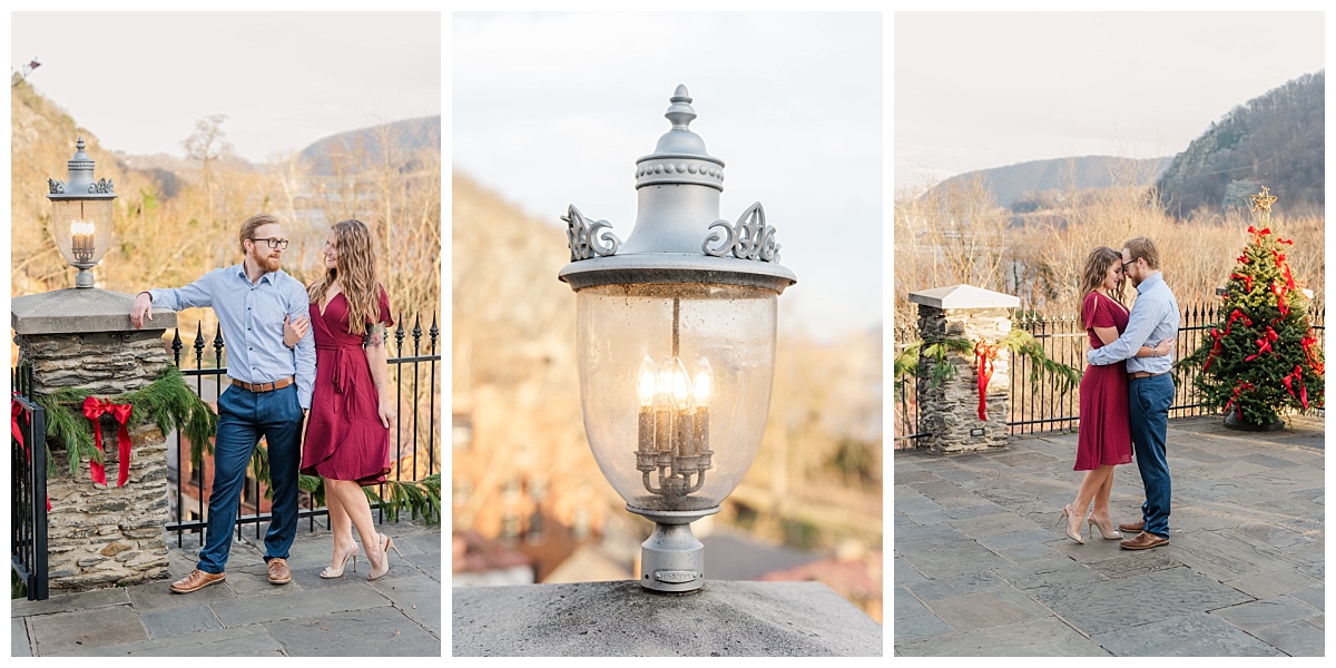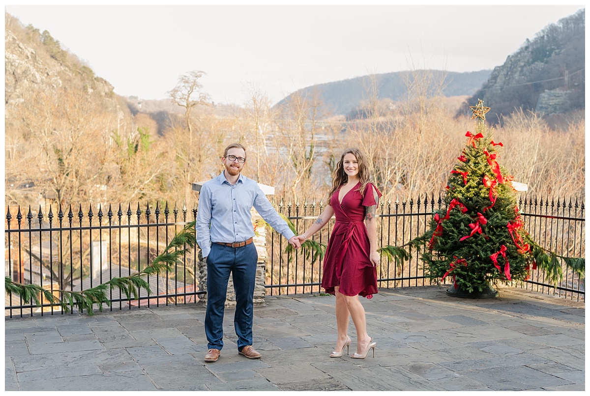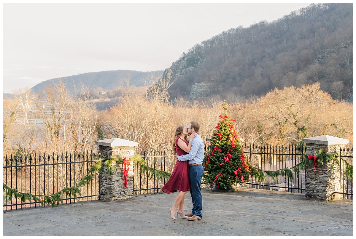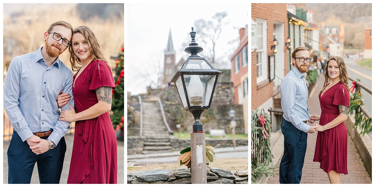 I had an amazing time exploring Harpers Ferry with Brandon and Laura for their engagement session this past weekend! I first met these two when I photographed Laura’s twin sister’s wedding in January of 2021. I am honored that I am now going to be able to capture their special day next May at Trumpet Vine Farms. We lucked out with the weather for this engagement session as the afternoon started out cloudy and ended with the most beautiful sunlight coming through the clouds! They were such good sports as we walked all over town and ventured both to the river as well as up the steep stairs to the front of the gorgeous St. Peters Catholic Church ! I love working with couples that are up for anything and just ready to have fun! Harpers Ferry was decorated for Christmas and we happened to be there on the Olde Tyme Christmas Celebration. We even ran into Mr. and Mrs. Claus! This engagement session in Harpers Ferry was beautiful and I can’t wait to spend more time with these two on their wedding day! For any one looking for engagement session locations Harpers Ferry is definitely one to add to the list as it has a huge variety of gorgeous backdrops!