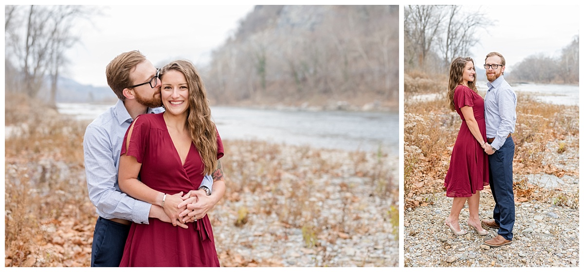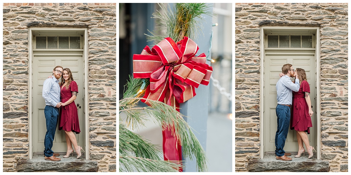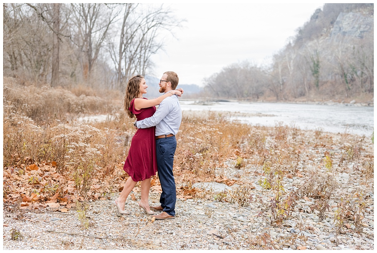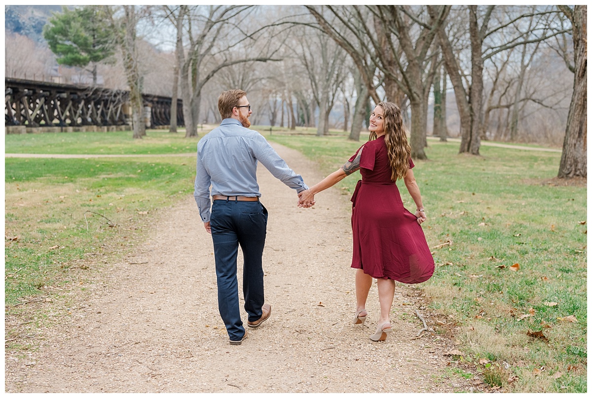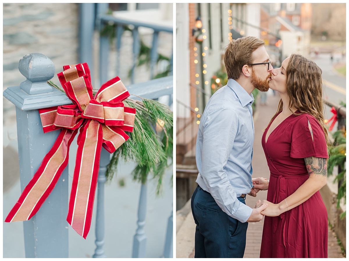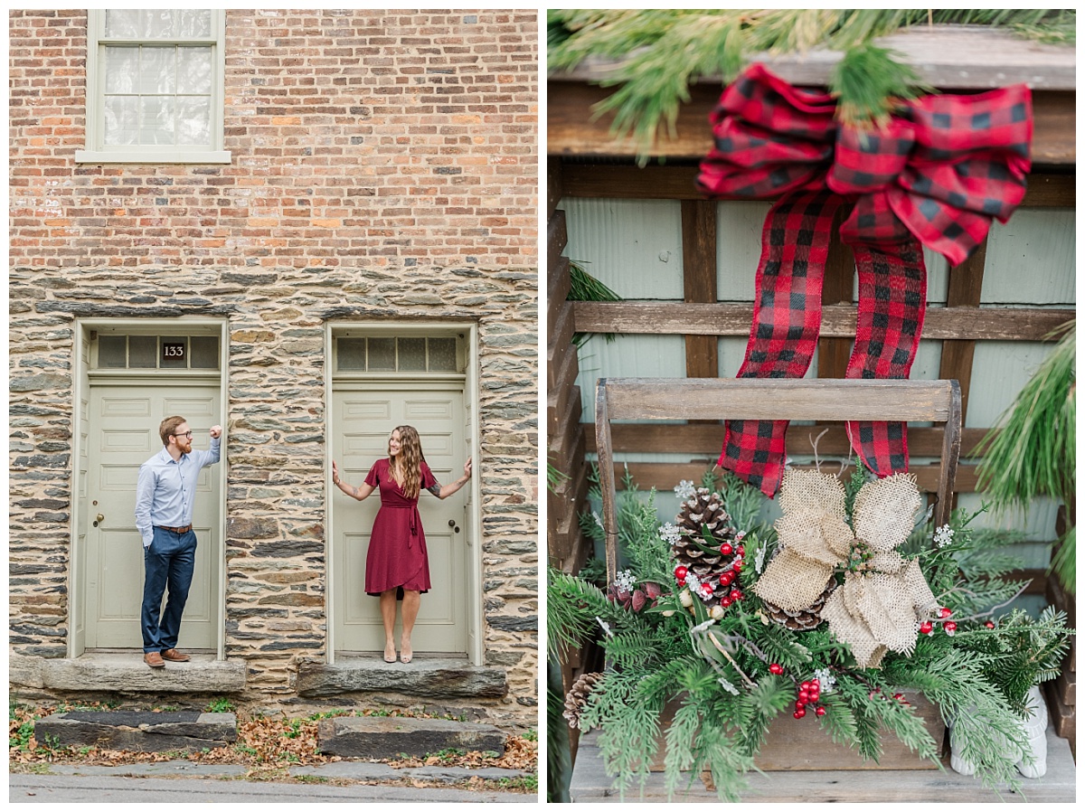 I had an amazing time exploring Harpers Ferry with Brandon and Laura for their engagement session this past weekend! I first met these two when I photographed Laura’s twin sister’s wedding in January of 2021. I am honored that I am now going to be able to capture their special day next May at Trumpet Vine Farms. We lucked out with the weather for this engagement session as the afternoon started out cloudy and ended with the most beautiful sunlight coming through the clouds! They were such good sports as we walked all over town and ventured both to the river as well as up the steep stairs to the front of the gorgeous St. Peters Catholic Church ! I love working with couples that are up for anything and just ready to have fun! Harpers Ferry was decorated for Christmas and we happened to be there on the Olde Tyme Christmas Celebration. We even ran into Mr. and Mrs. Claus! This engagement session in Harpers Ferry was beautiful and I can’t wait to spend more time with these two on their wedding day! For any one looking for engagement session locations Harpers Ferry is definitely one to add to the list as it has a huge variety of gorgeous backdrops!