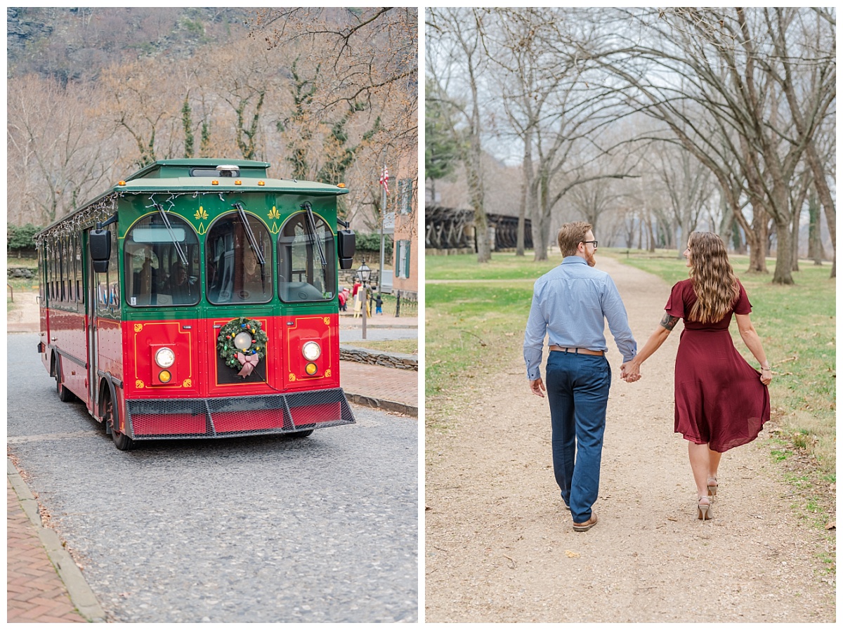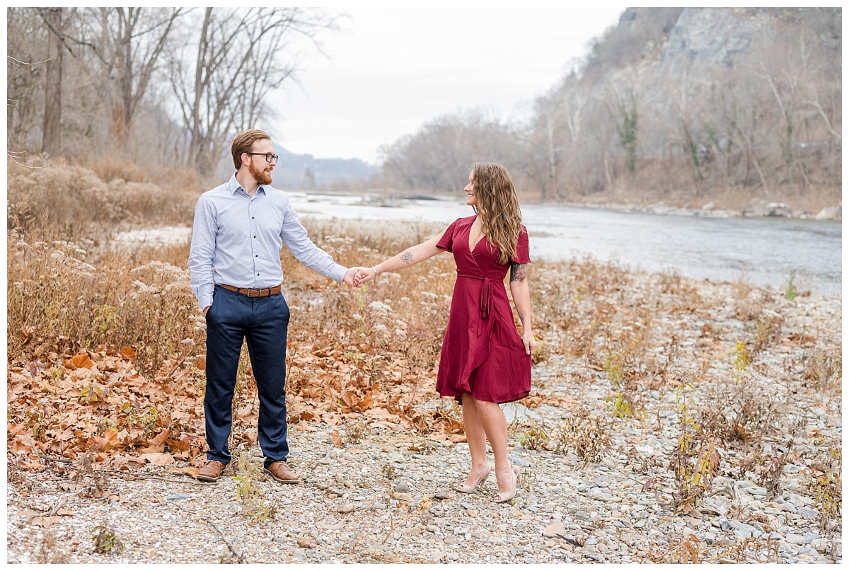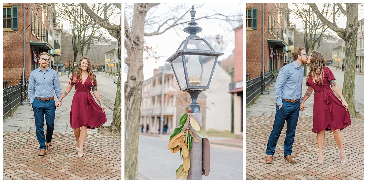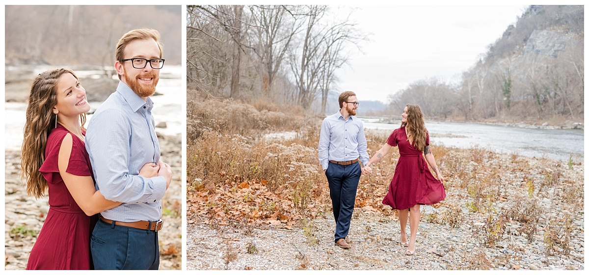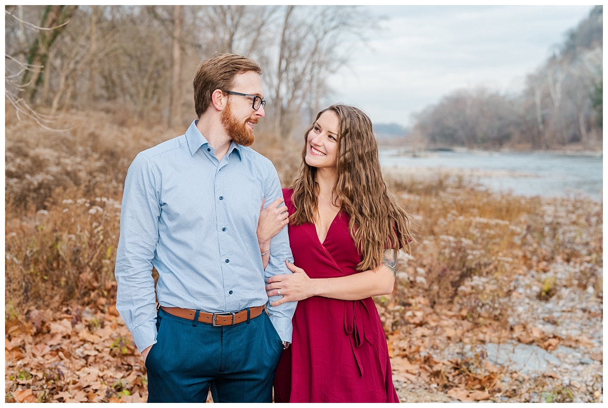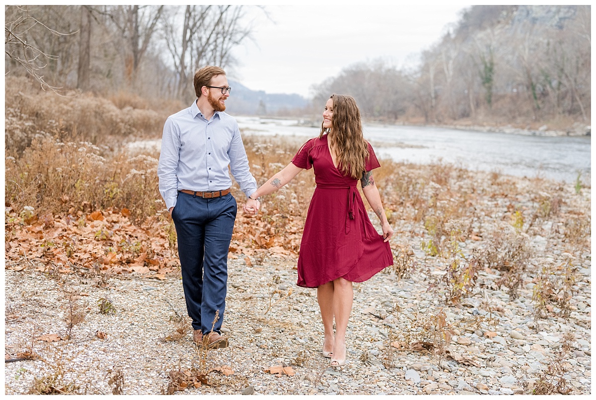 I had an amazing time exploring Harpers Ferry with Brandon and Laura for their engagement session this past weekend! I first met these two when I photographed Laura’s twin sister’s wedding in January of 2021. I am honored that I am now going to be able to capture their special day next May at Trumpet Vine Farms. We lucked out with the weather for this engagement session as the afternoon started out cloudy and ended with the most beautiful sunlight coming through the clouds! They were such good sports as we walked all over town and ventured both to the river as well as up the steep stairs to the front of the gorgeous St. Peters Catholic Church ! I love working with couples that are up for anything and just ready to have fun! Harpers Ferry was decorated for Christmas and we happened to be there on the Olde Tyme Christmas Celebration. We even ran into Mr. and Mrs. Claus! This engagement session in Harpers Ferry was beautiful and I can’t wait to spend more time with these two on their wedding day! For any one looking for engagement session locations Harpers Ferry is definitely one to add to the list as it has a huge variety of gorgeous backdrops!