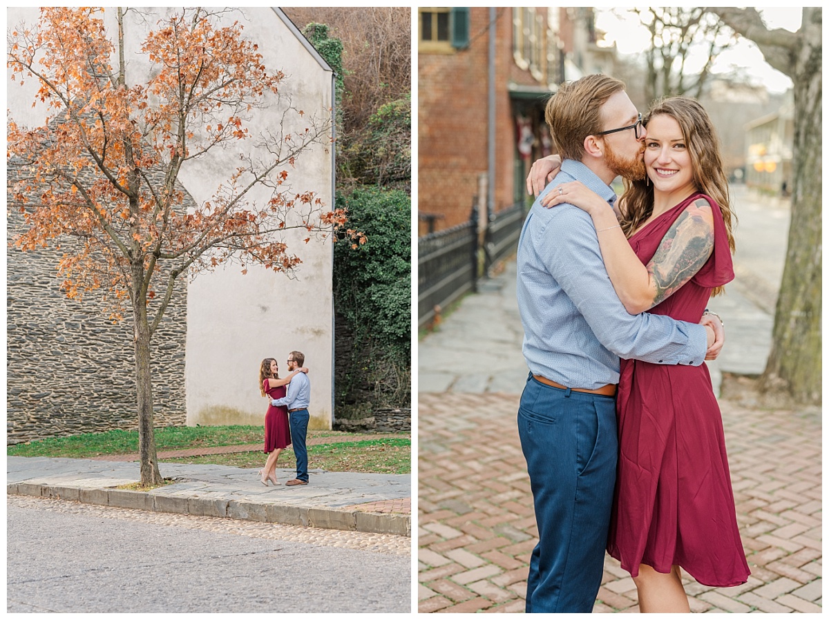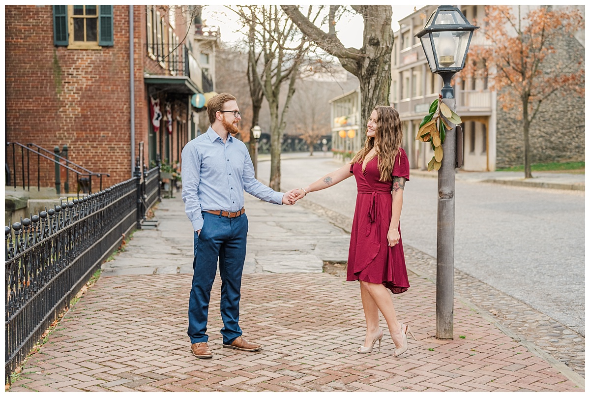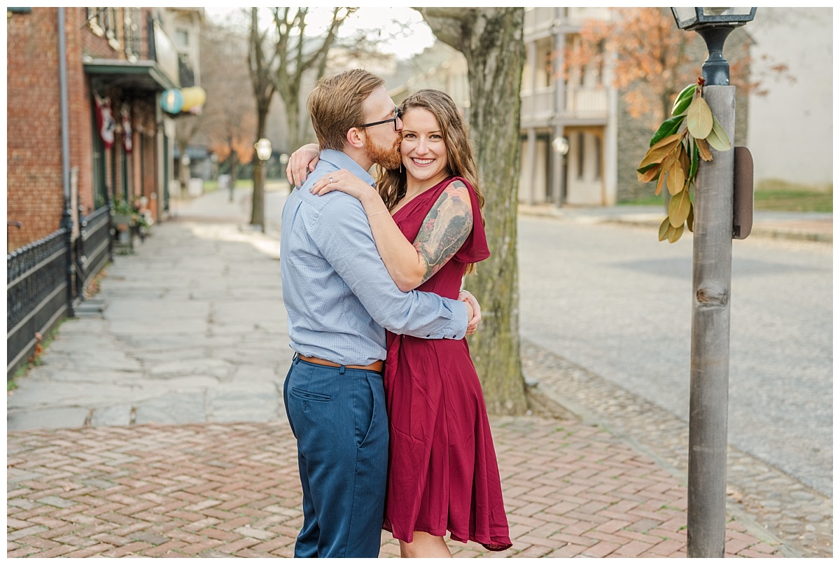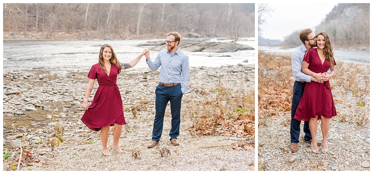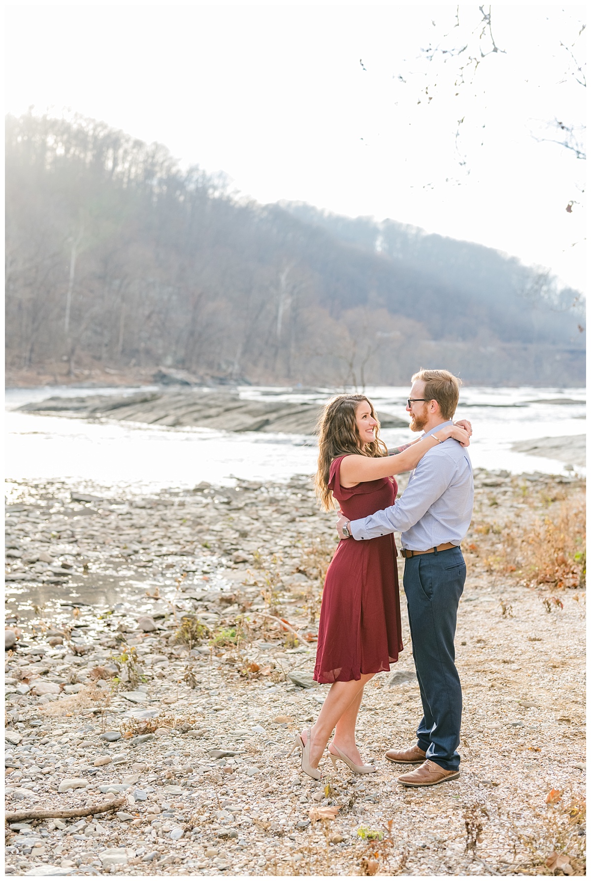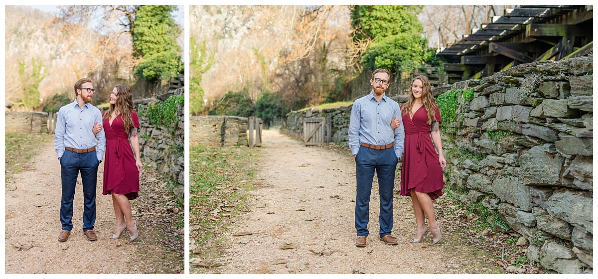 I had an amazing time exploring Harpers Ferry with Brandon and Laura for their engagement session this past weekend! I first met these two when I photographed Laura’s twin sister’s wedding in January of 2021. I am honored that I am now going to be able to capture their special day next May at Trumpet Vine Farms. We lucked out with the weather for this engagement session as the afternoon started out cloudy and ended with the most beautiful sunlight coming through the clouds! They were such good sports as we walked all over town and ventured both to the river as well as up the steep stairs to the front of the gorgeous St. Peters Catholic Church ! I love working with couples that are up for anything and just ready to have fun! Harpers Ferry was decorated for Christmas and we happened to be there on the Olde Tyme Christmas Celebration. We even ran into Mr. and Mrs. Claus! This engagement session in Harpers Ferry was beautiful and I can’t wait to spend more time with these two on their wedding day! For any one looking for engagement session locations Harpers Ferry is definitely one to add to the list as it has a huge variety of gorgeous backdrops!