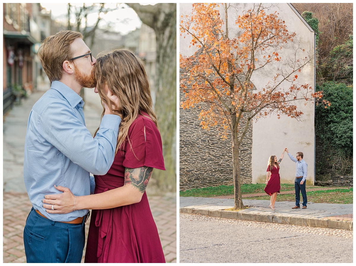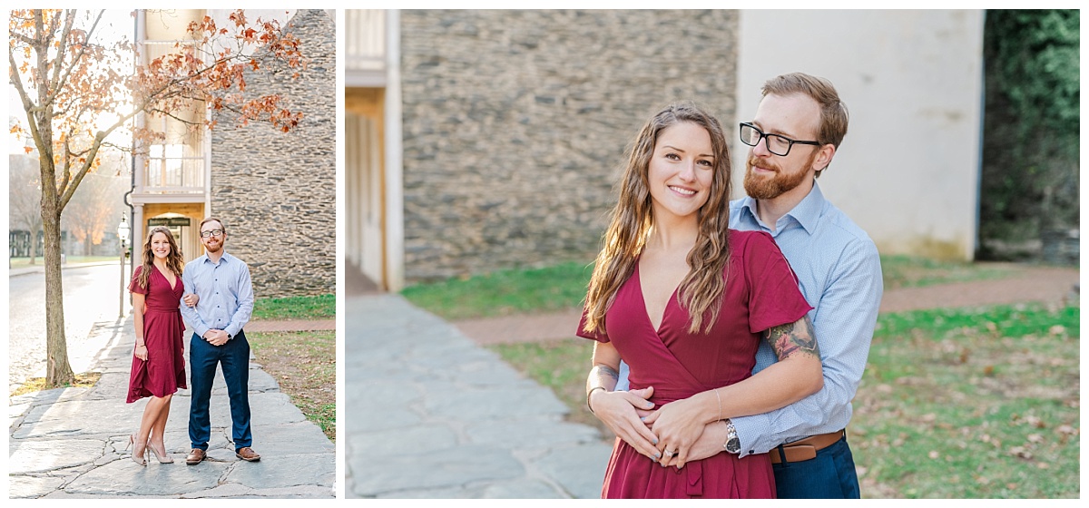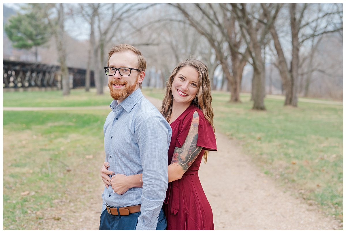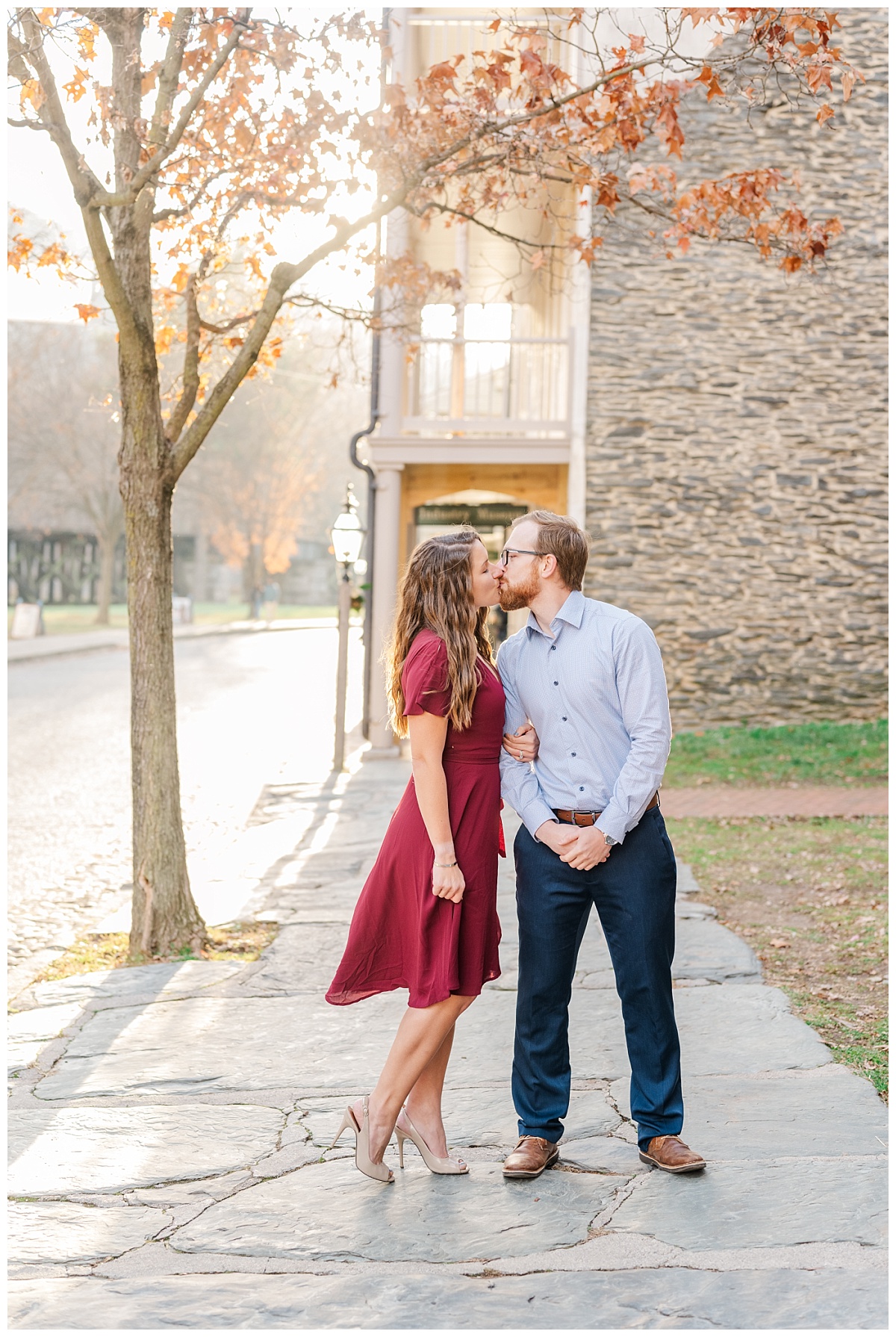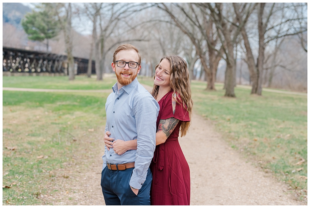 I had an amazing time exploring Harpers Ferry with Brandon and Laura for their engagement session this past weekend! I first met these two when I photographed Laura’s twin sister’s wedding in January of 2021. I am honored that I am now going to be able to capture their special day next May at Trumpet Vine Farms. We lucked out with the weather for this engagement session as the afternoon started out cloudy and ended with the most beautiful sunlight coming through the clouds! They were such good sports as we walked all over town and ventured both to the river as well as up the steep stairs to the front of the gorgeous St. Peters Catholic Church ! I love working with couples that are up for anything and just ready to have fun! Harpers Ferry was decorated for Christmas and we happened to be there on the Olde Tyme Christmas Celebration. We even ran into Mr. and Mrs. Claus! This engagement session in Harpers Ferry was beautiful and I can’t wait to spend more time with these two on their wedding day! For any one looking for engagement session locations Harpers Ferry is definitely one to add to the list as it has a huge variety of gorgeous backdrops!
