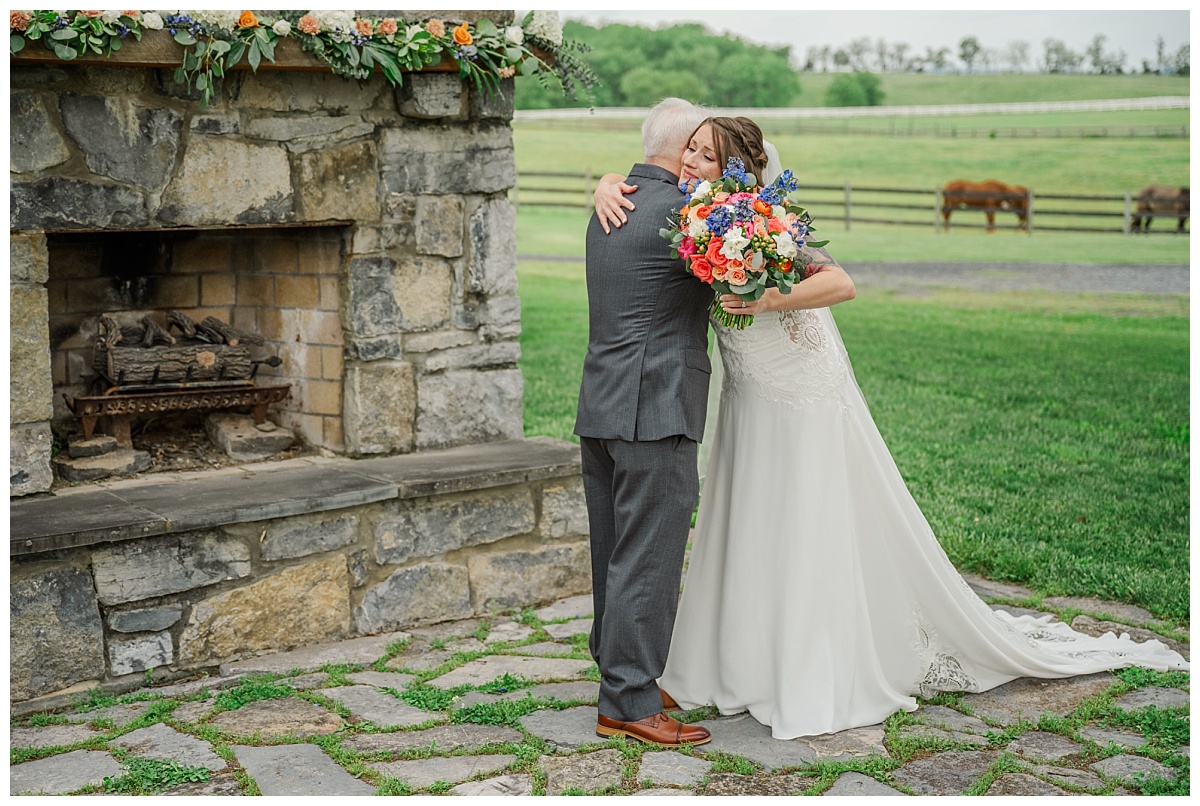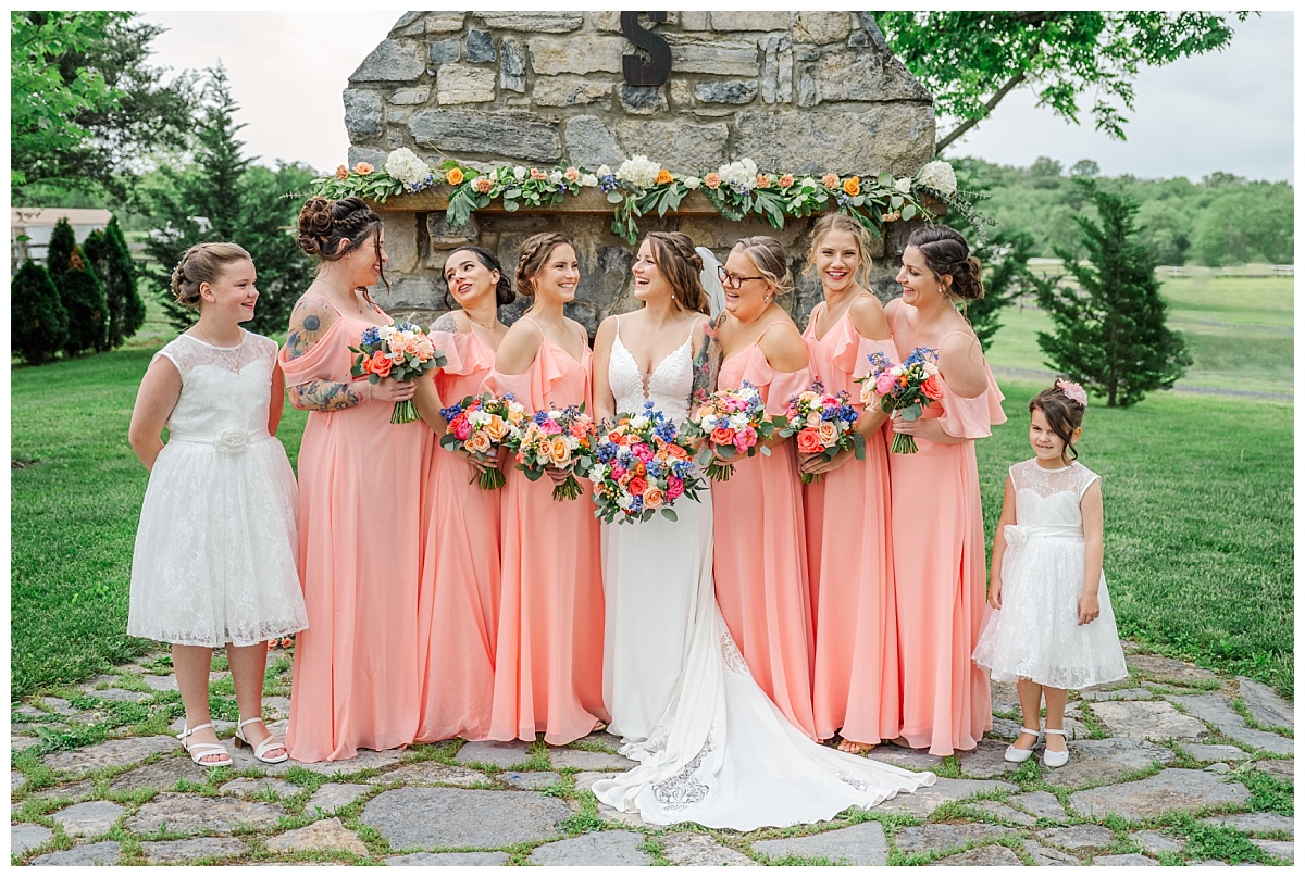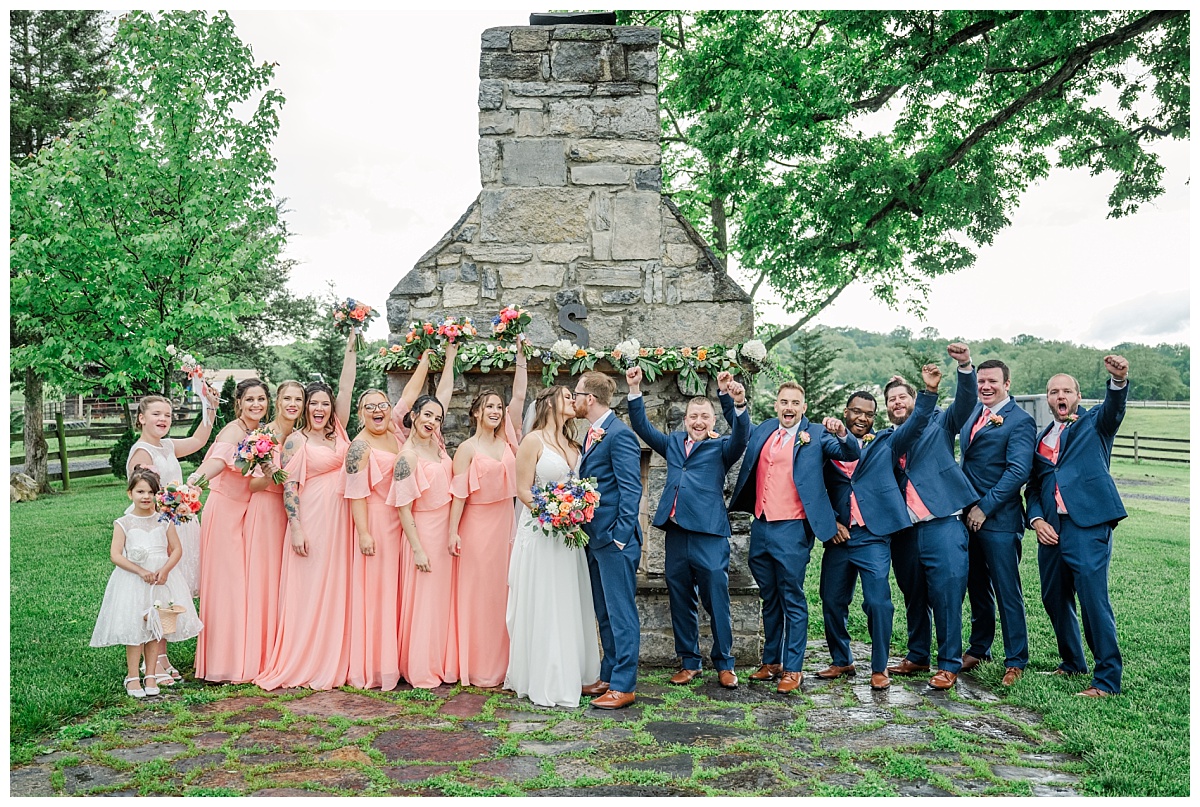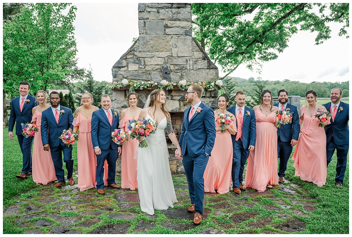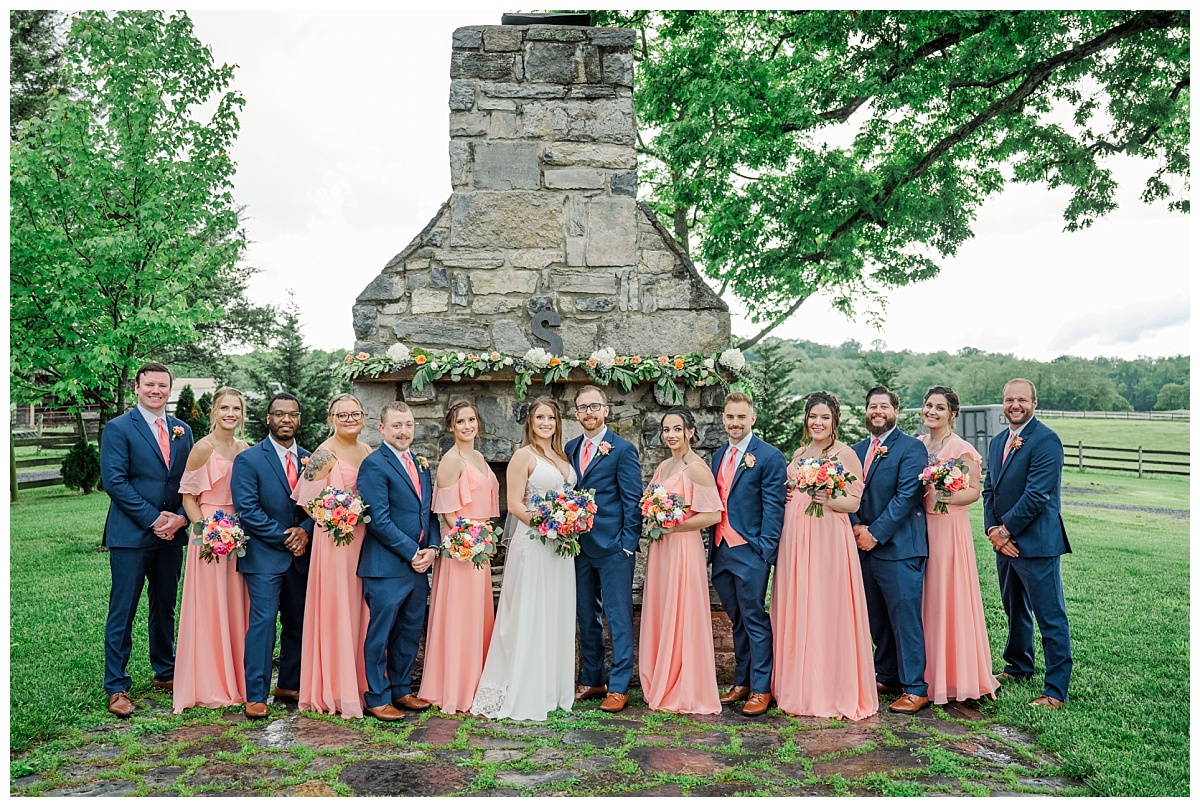What a wonderful day it was celebrating the wedding of Brandon and Laura at Trumpet Vine Farm in Stephens City, Virginia!  Trumpet Vine Farm was the perfect backdrop for this gorgeous farm wedding.   The weather forecast was variable throughout the week and we were so thrilled that most of the day the rain held off!  We were able to capture beautiful moments outside with the outdoor stone fireplace and horse fields. We even had some golden glow of sunshine after a short rain storm!  I also love that Trumpet Vine Farm has horses that love to be part of portraits as the bride and her family are all horse lovers!   I had such a great time spending the day with this amazing couple and getting to know some of their closest family and friends.  It was so wonderful to see Laura’s family again, as I had so much fun photographing her twin sister’s wedding two years ago!  The florals for this wedding were absolutely stunning with their pops of blues and corals!   I was so honored to be part of this special day and love when I am able to create memories that will last a lifetime!  Congratulations to the new Mr. and Mrs. Smith!!!