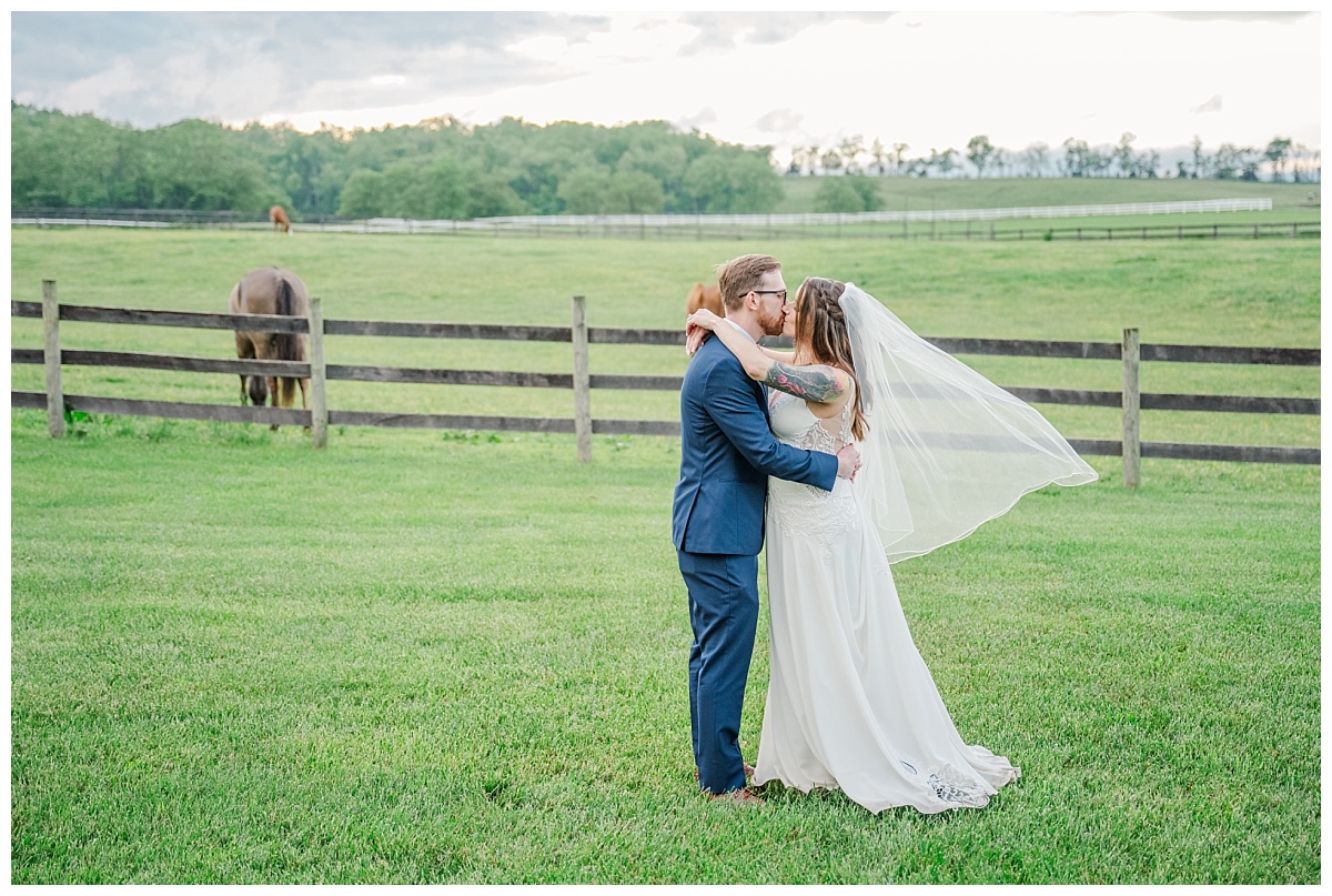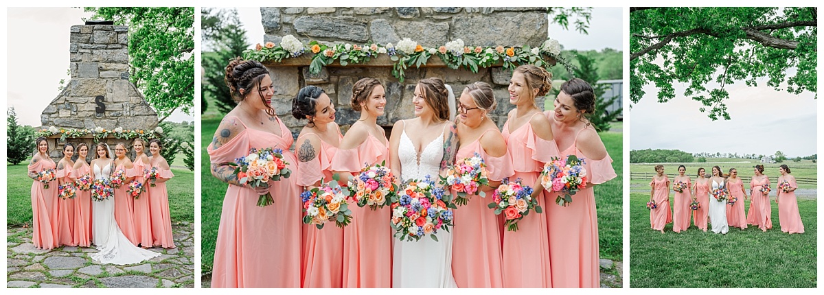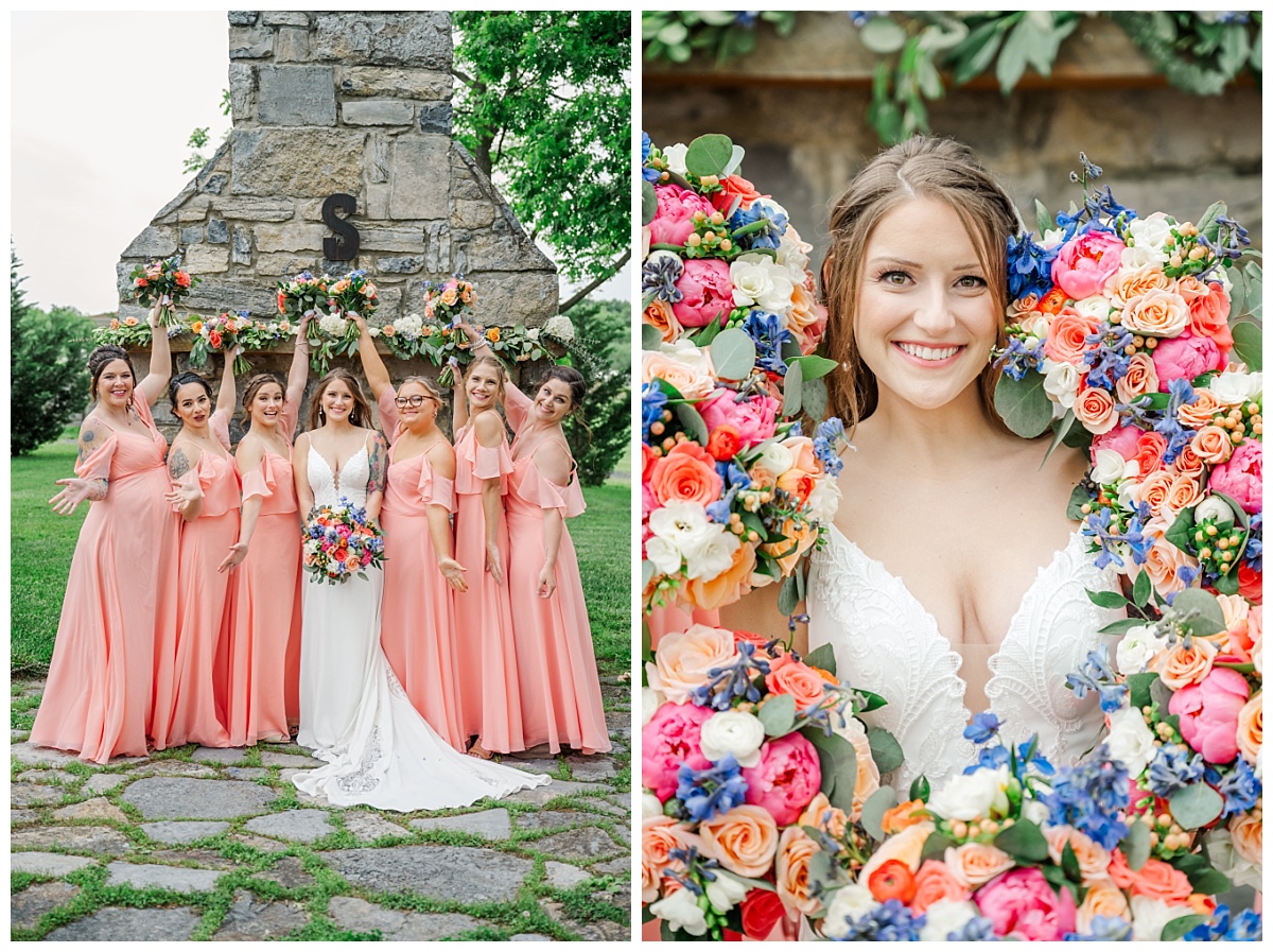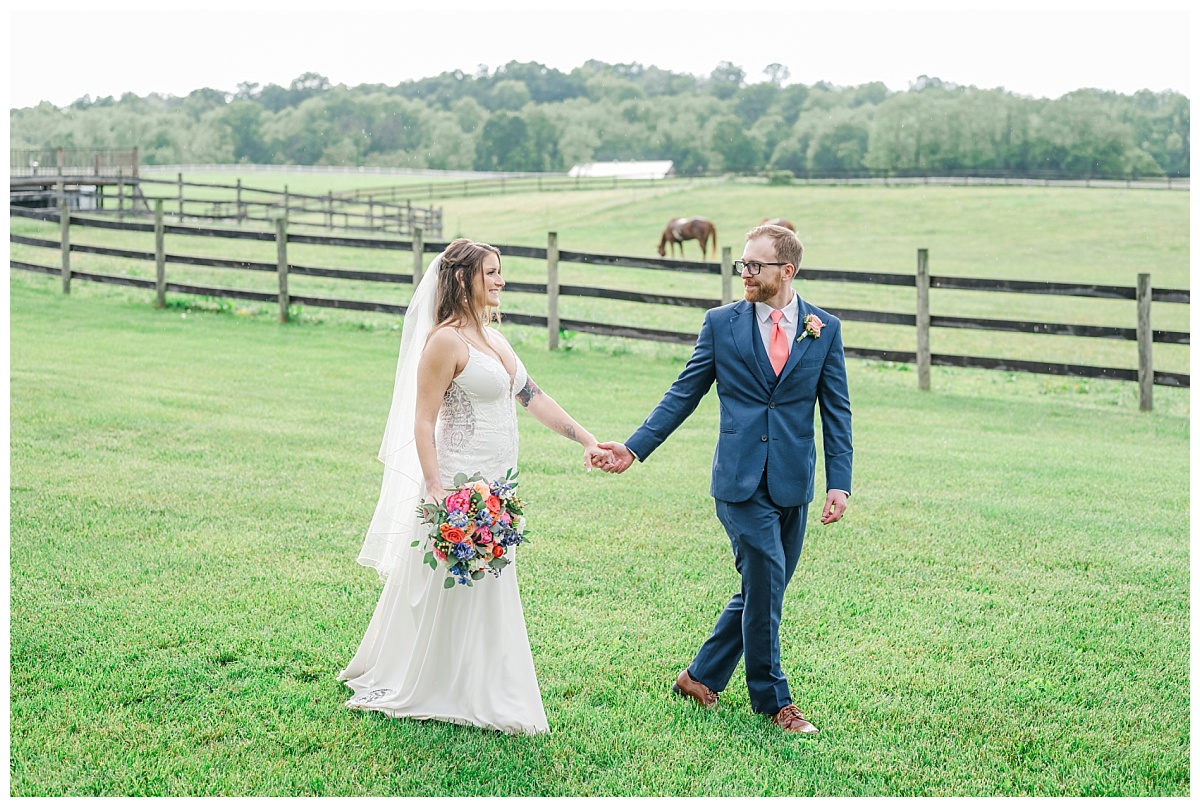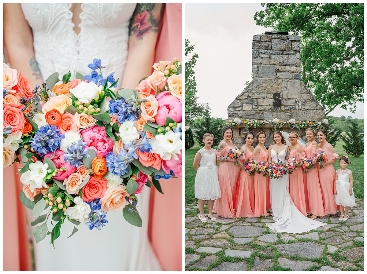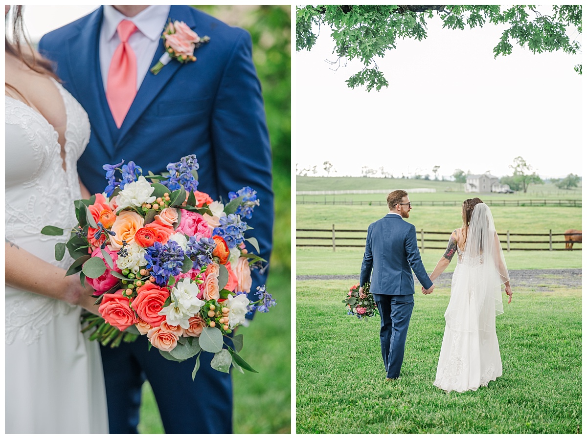 What a wonderful day it was celebrating the wedding of Brandon and Laura at Trumpet Vine Farm in Stephens City, Virginia!  Trumpet Vine Farm was the perfect backdrop for this gorgeous farm wedding.   The weather forecast was variable throughout the week and we were so thrilled that most of the day the rain held off!  We were able to capture beautiful moments outside with the outdoor stone fireplace and horse fields. We even had some golden glow of sunshine after a short rain storm!  I also love that Trumpet Vine Farm has horses that love to be part of portraits as the bride and her family are all horse lovers!   I had such a great time spending the day with this amazing couple and getting to know some of their closest family and friends.  It was so wonderful to see Laura’s family again, as I had so much fun photographing her twin sister’s wedding two years ago!  The florals for this wedding were absolutely stunning with their pops of blues and corals!   I was so honored to be part of this special day and love when I am able to create memories that will last a lifetime!  Congratulations to the new Mr. and Mrs. Smith!!!
