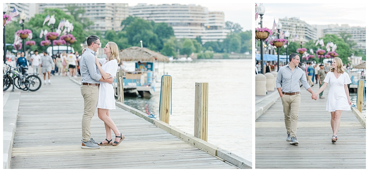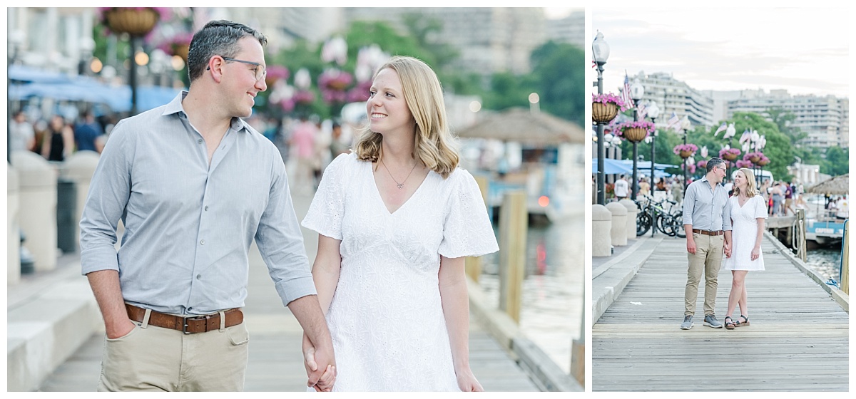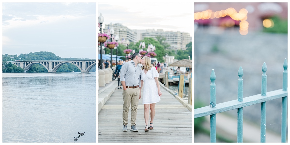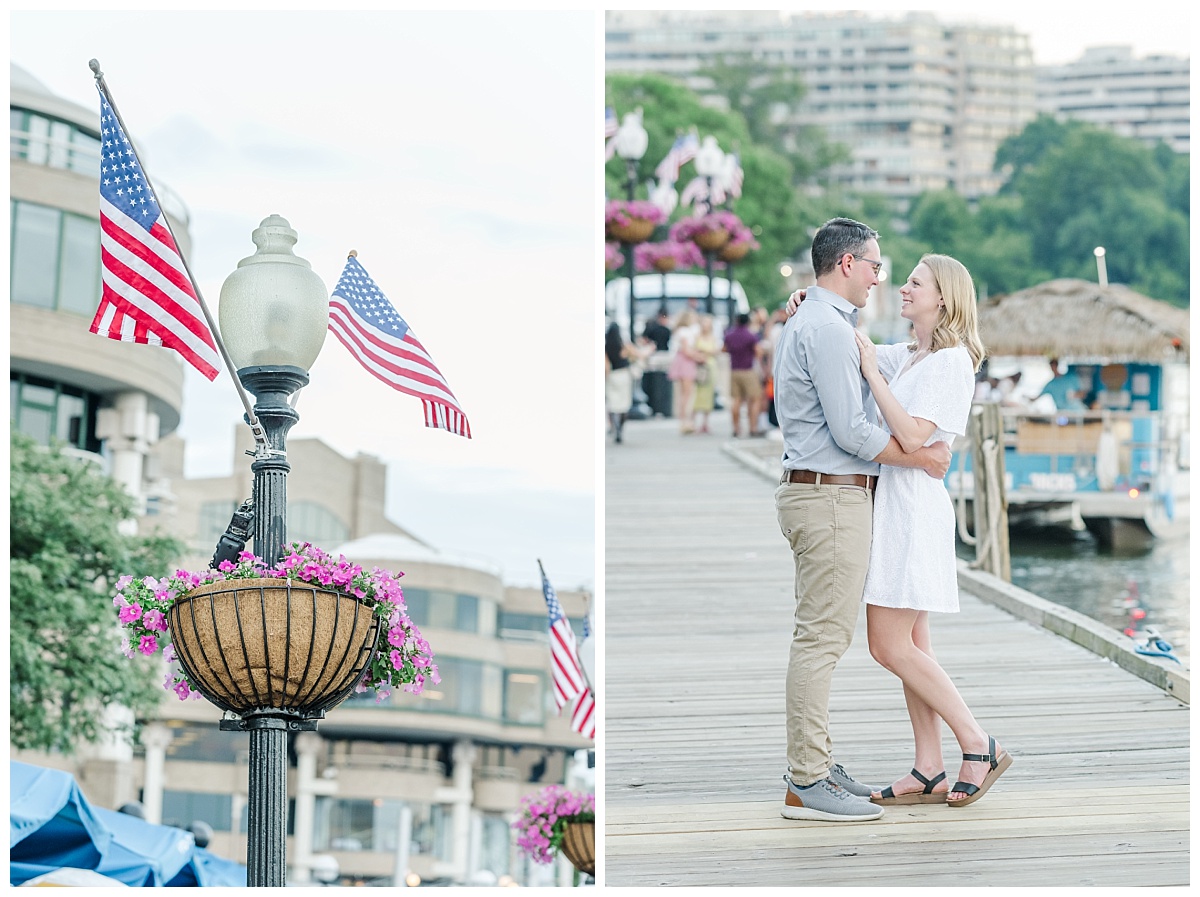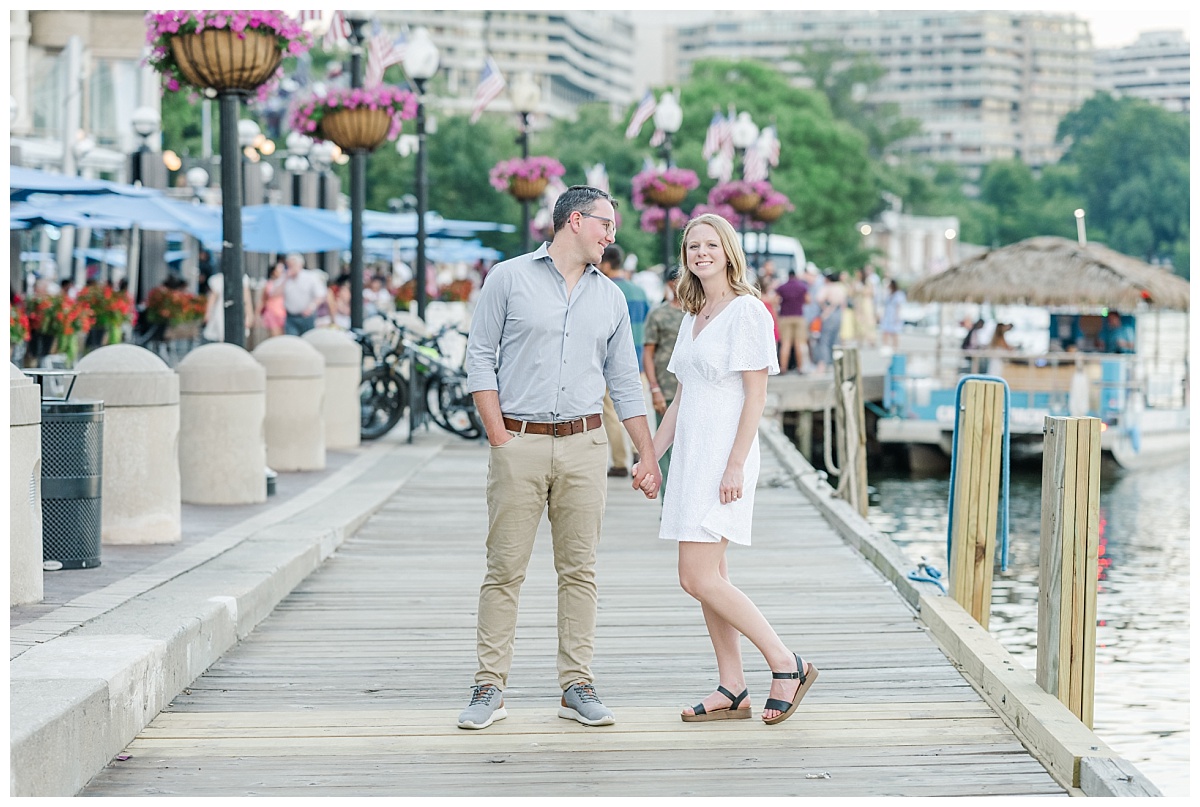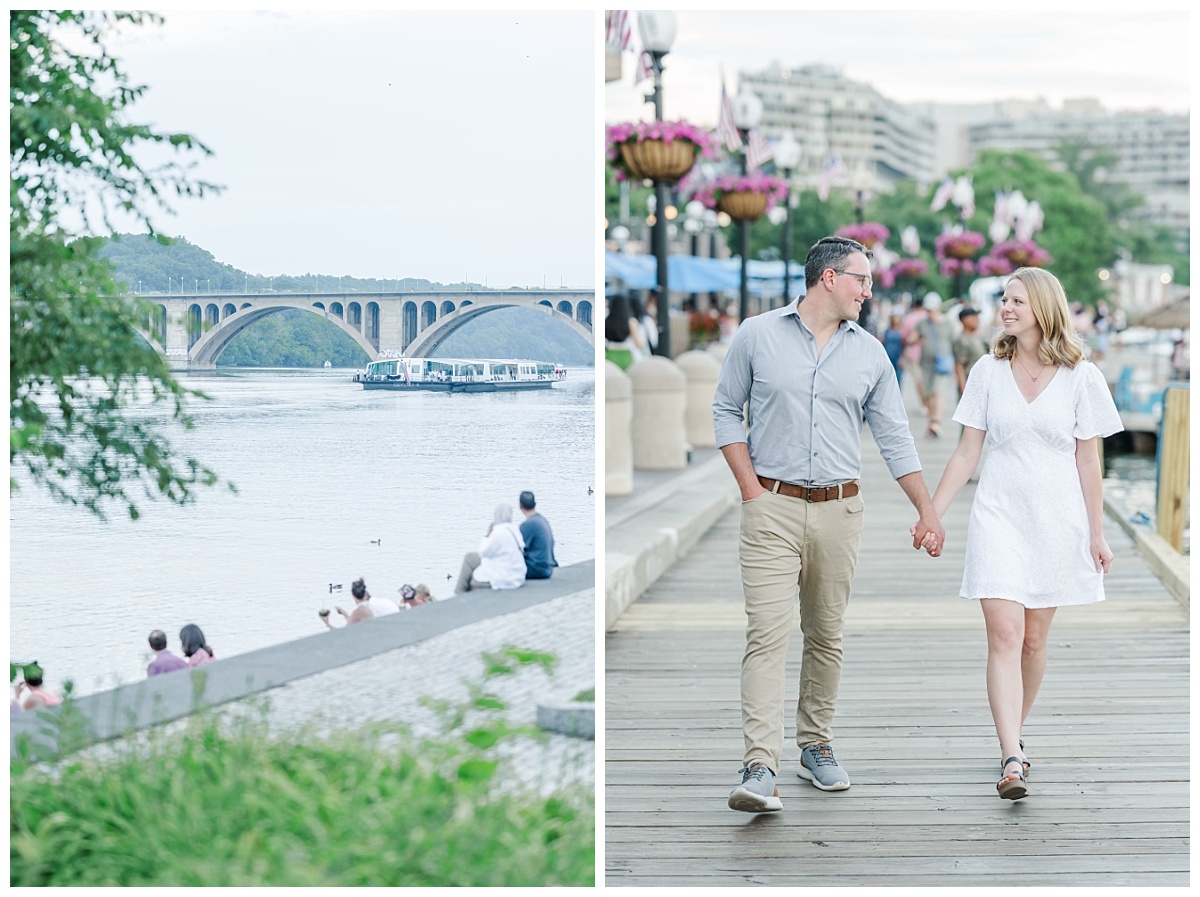 We then headed down to the Georgetown Waterfront Park and went to the official spot that they were engaged last year. There is a spectacular view of the river with the Kennedy Center and the Key bridge. Afterwards we stopped to take a few pictures by the water fountain that was filled with children playing in the summer heat! Eventually we finished our session on the boardwalk with the most beautiful floral hanging pots lining the busy walkway.