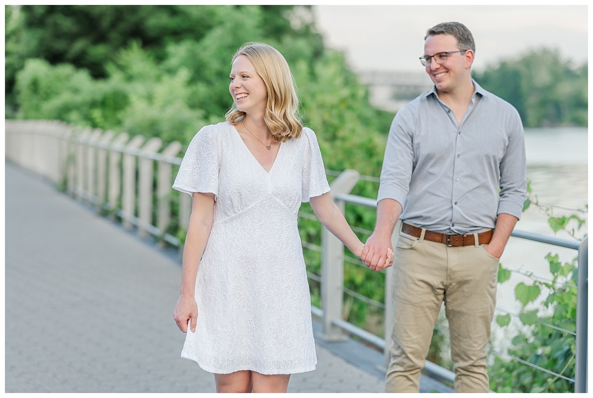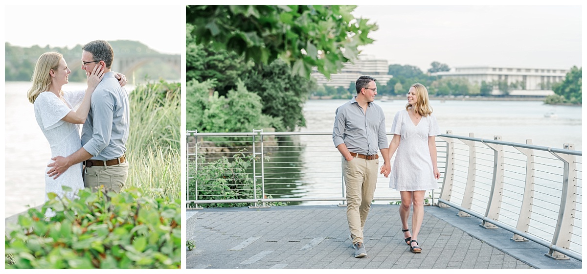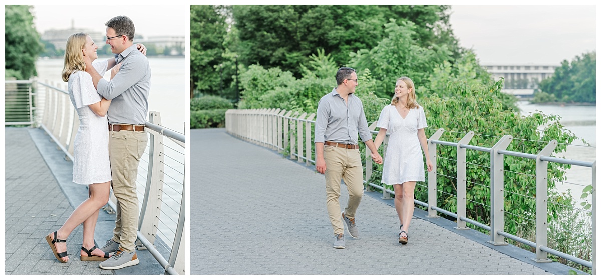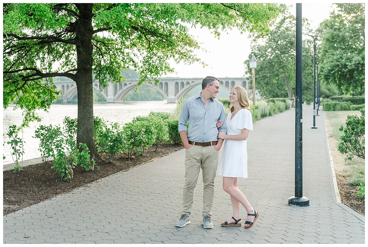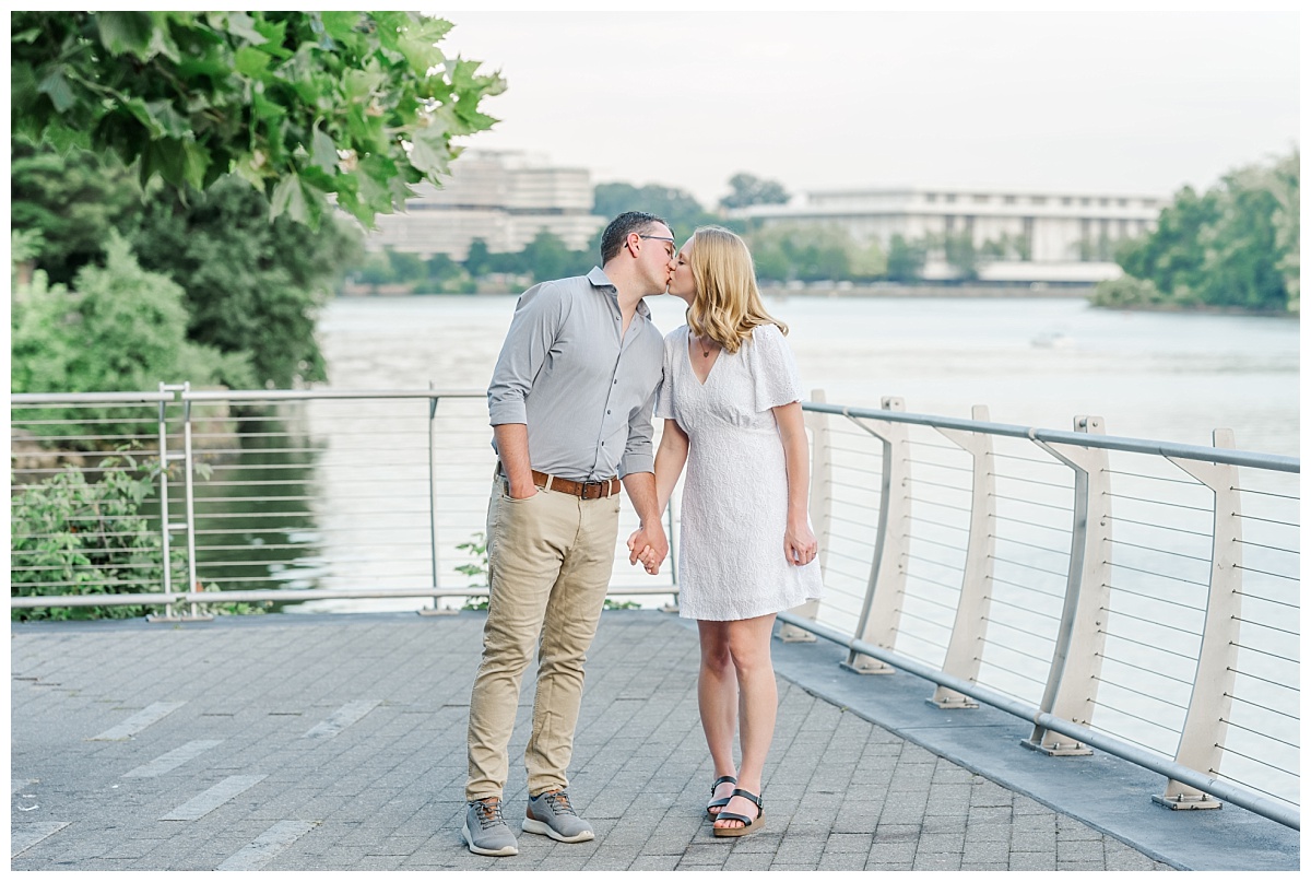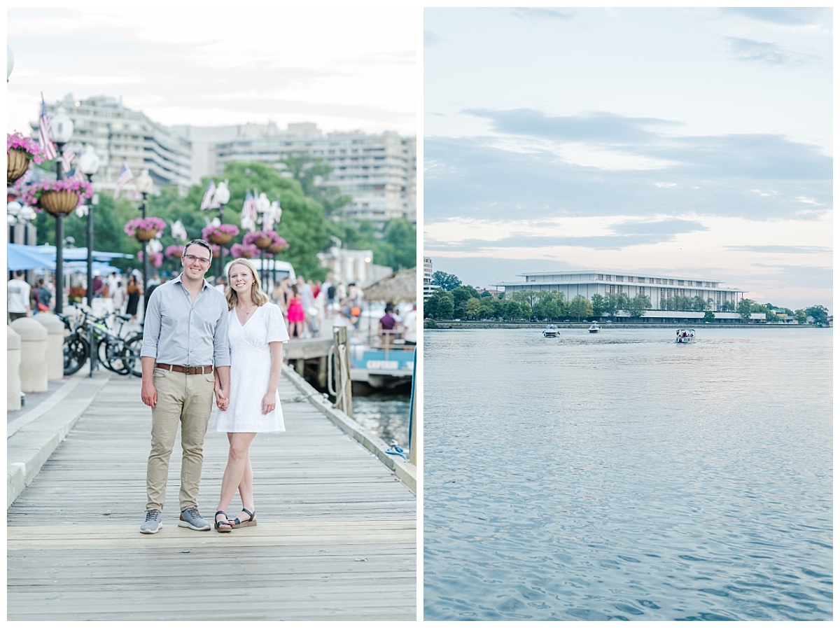 We then headed down to the Georgetown Waterfront Park and went to the official spot that they were engaged last year. There is a spectacular view of the river with the Kennedy Center and the Key bridge. Afterwards we stopped to take a few pictures by the water fountain that was filled with children playing in the summer heat! Eventually we finished our session on the boardwalk with the most beautiful floral hanging pots lining the busy walkway.