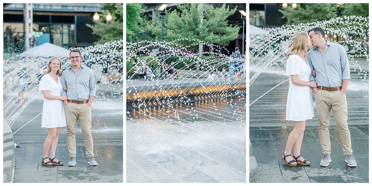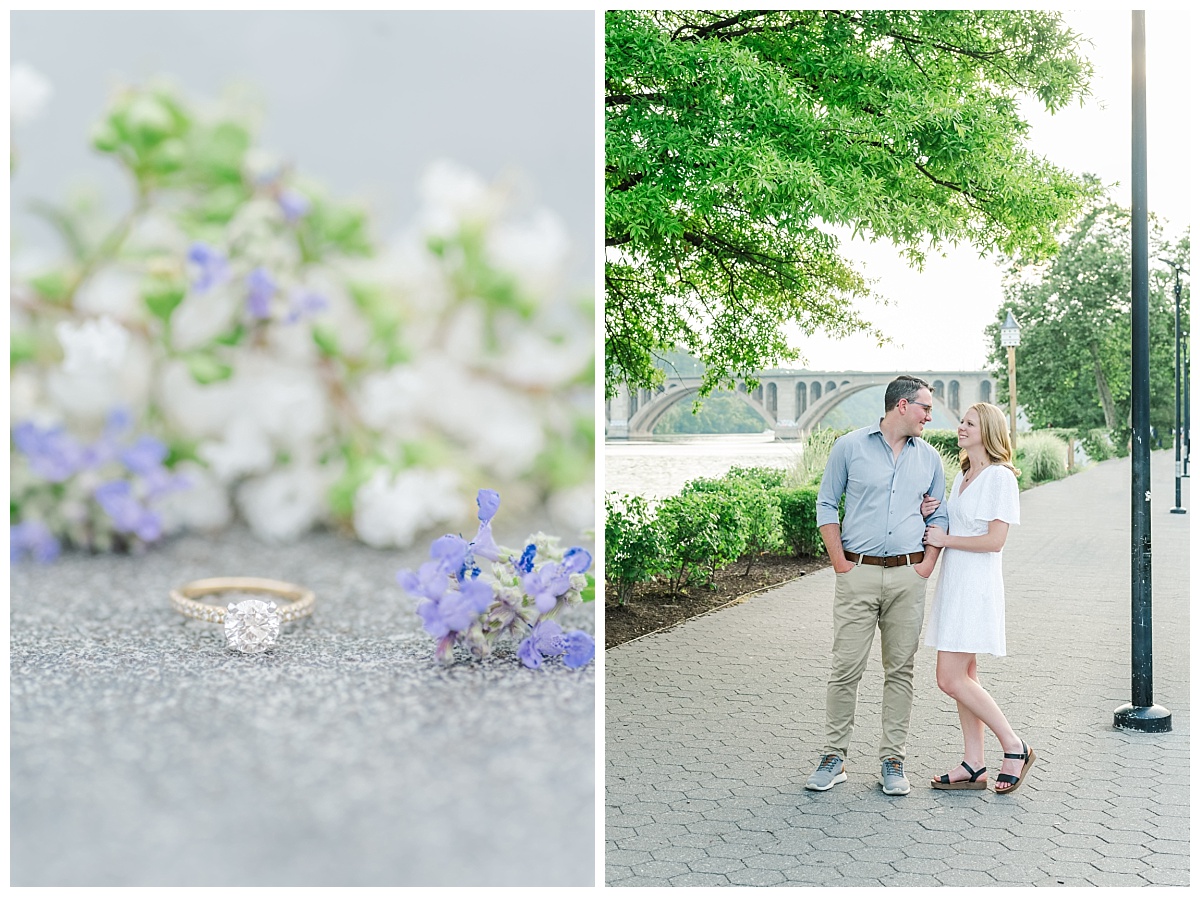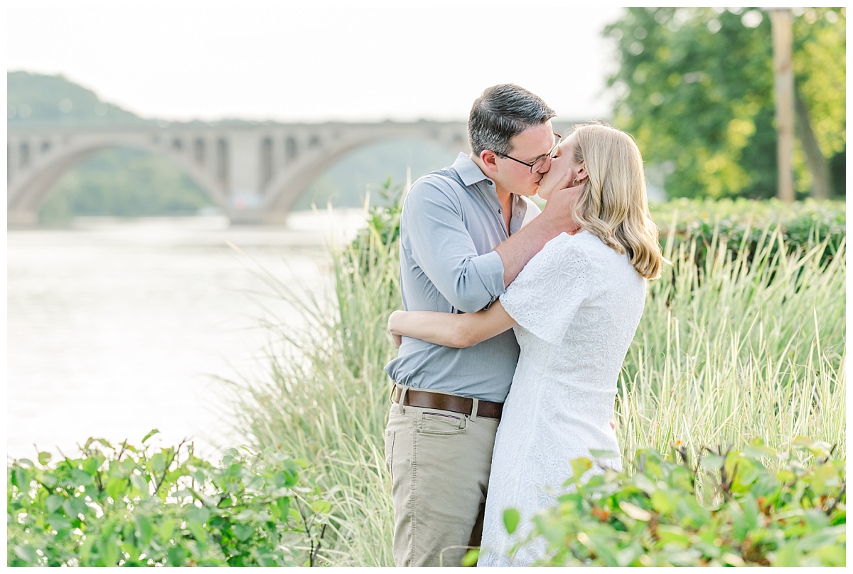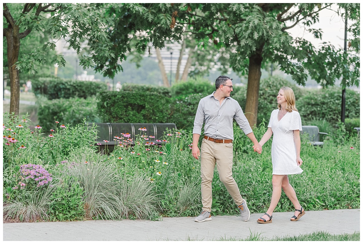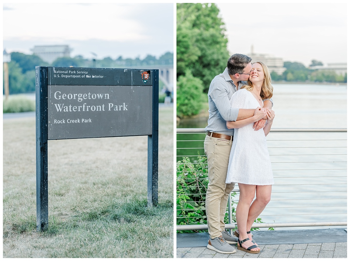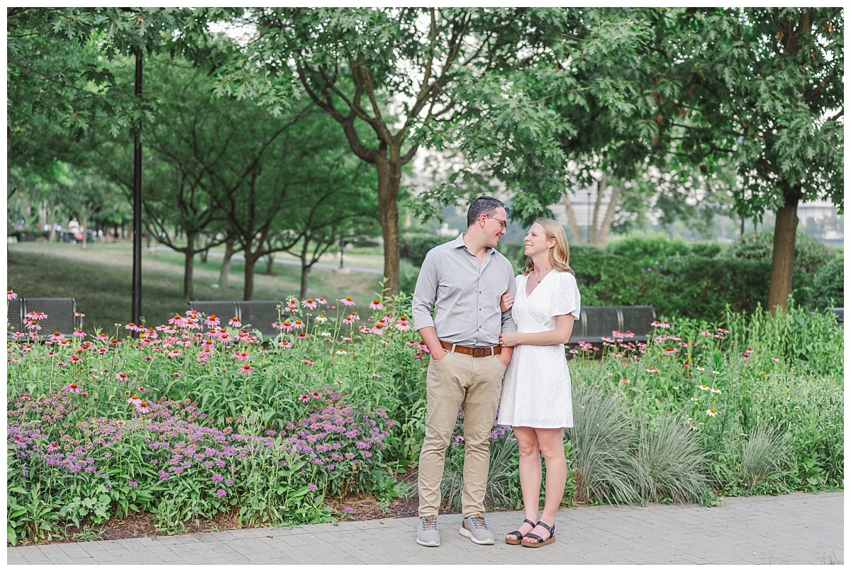 We then headed down to the Georgetown Waterfront Park and went to the official spot that they were engaged last year. There is a spectacular view of the river with the Kennedy Center and the Key bridge. Afterwards we stopped to take a few pictures by the water fountain that was filled with children playing in the summer heat! Eventually we finished our session on the boardwalk with the most beautiful floral hanging pots lining the busy walkway.
