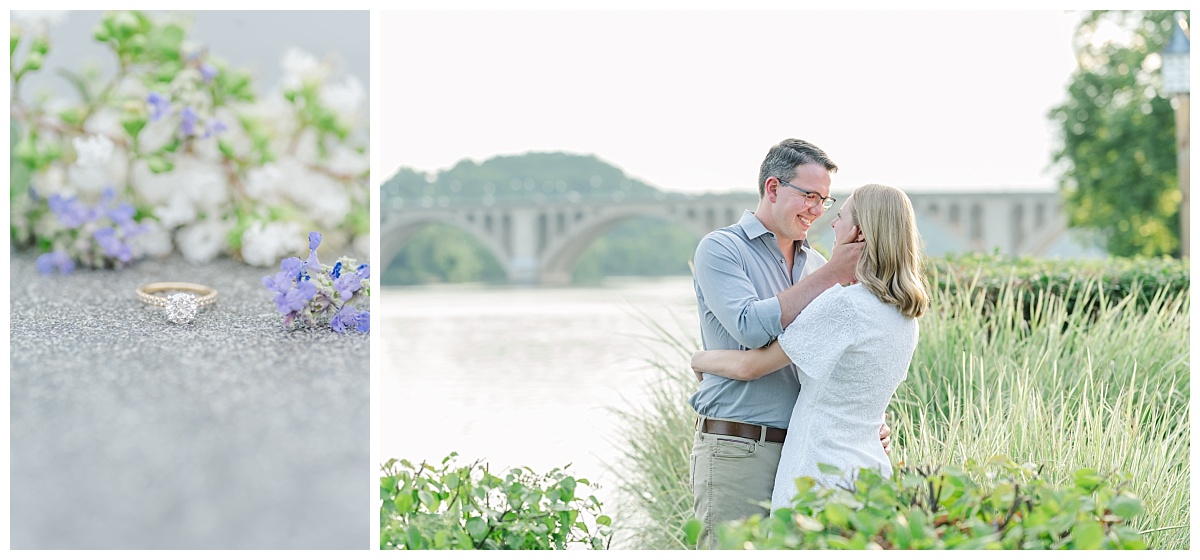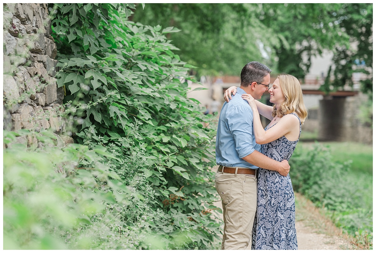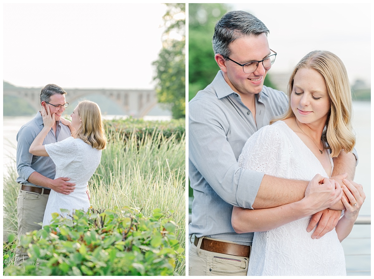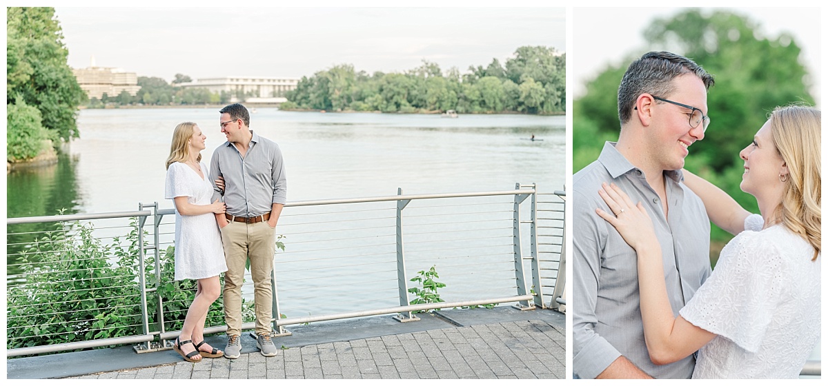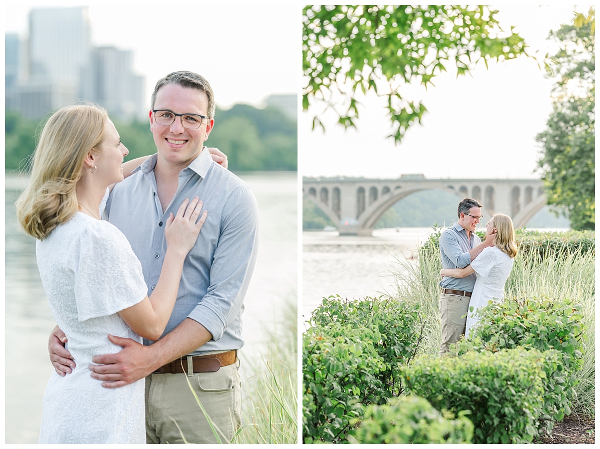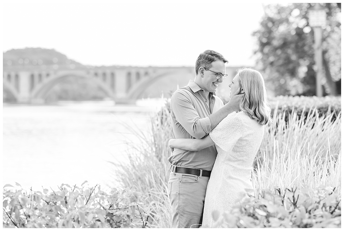 We then headed down to the Georgetown Waterfront Park and went to the official spot that they were engaged last year. There is a spectacular view of the river with the Kennedy Center and the Key bridge. Afterwards we stopped to take a few pictures by the water fountain that was filled with children playing in the summer heat! Eventually we finished our session on the boardwalk with the most beautiful floral hanging pots lining the busy walkway.