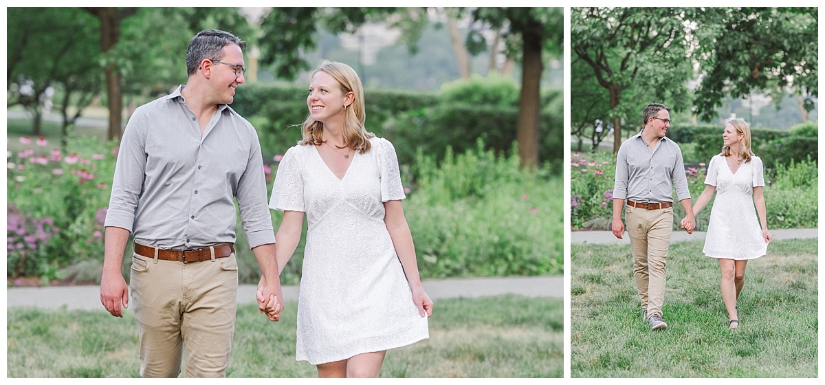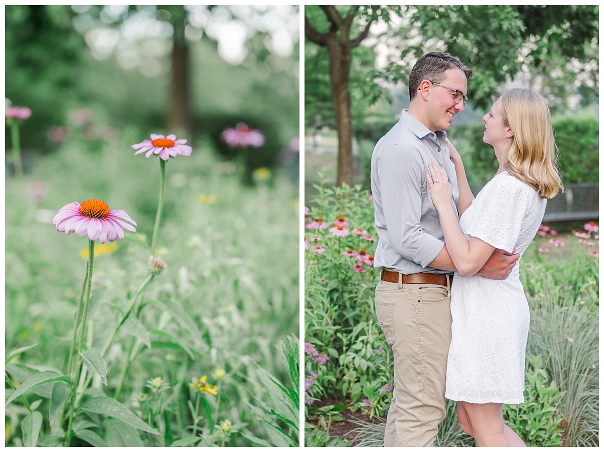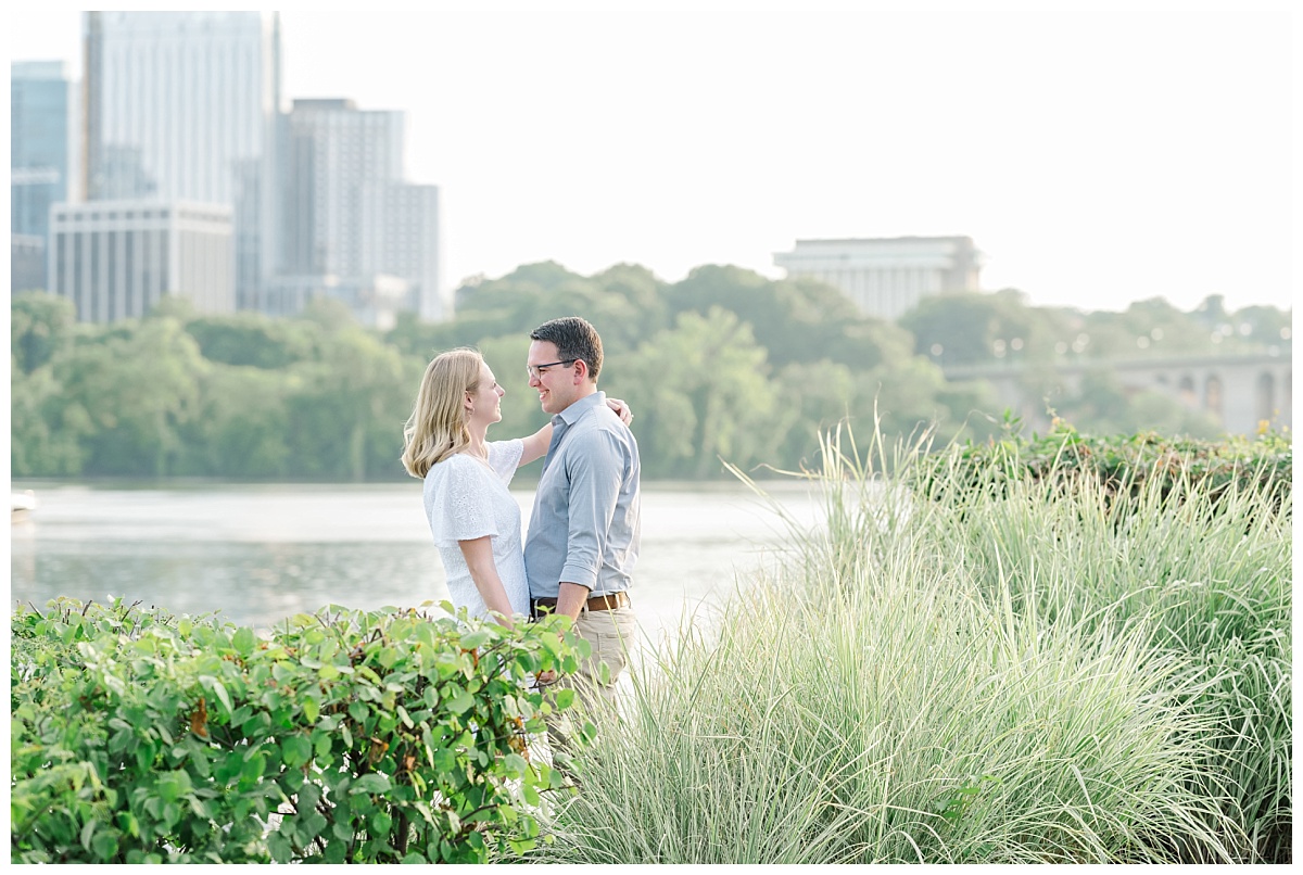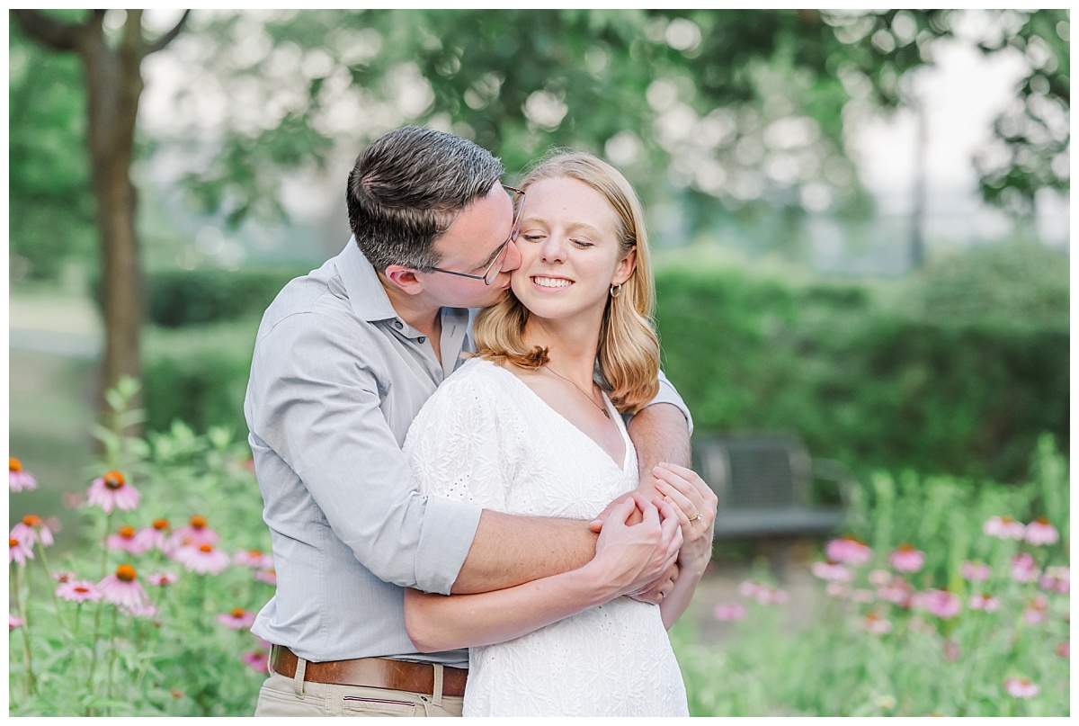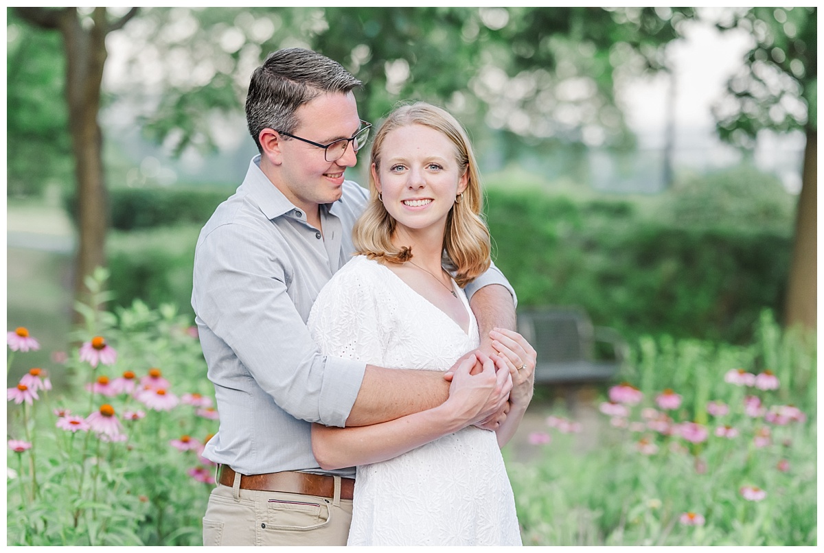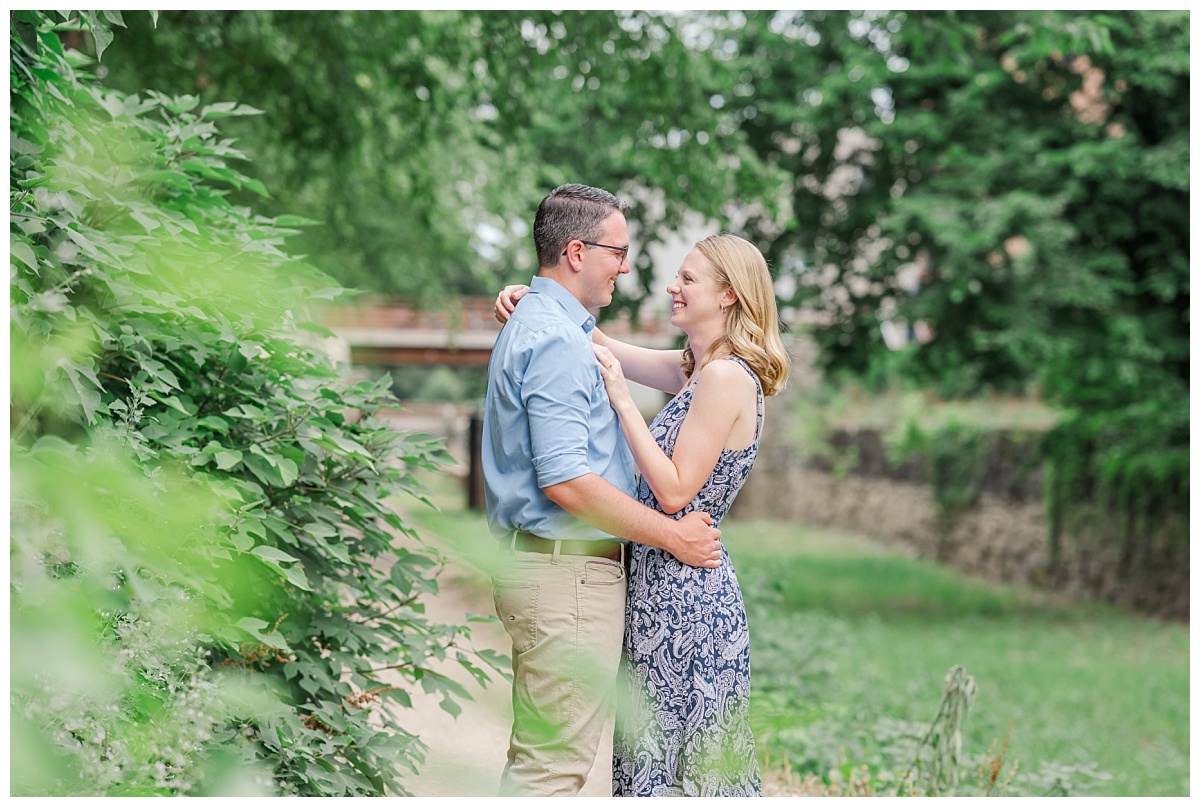 We then headed down to the Georgetown Waterfront Park and went to the official spot that they were engaged last year. There is a spectacular view of the river with the Kennedy Center and the Key bridge. Afterwards we stopped to take a few pictures by the water fountain that was filled with children playing in the summer heat! Eventually we finished our session on the boardwalk with the most beautiful floral hanging pots lining the busy walkway.