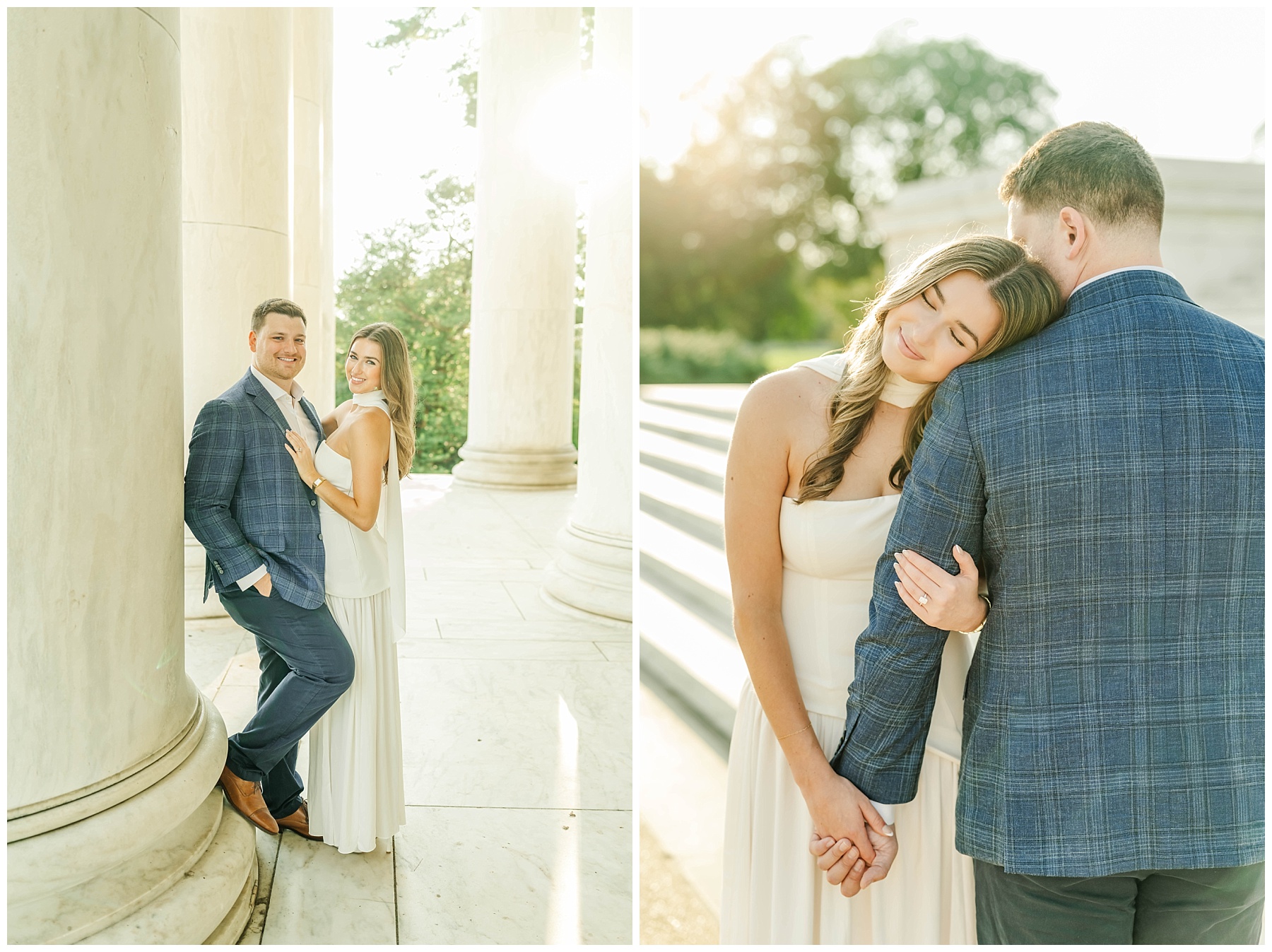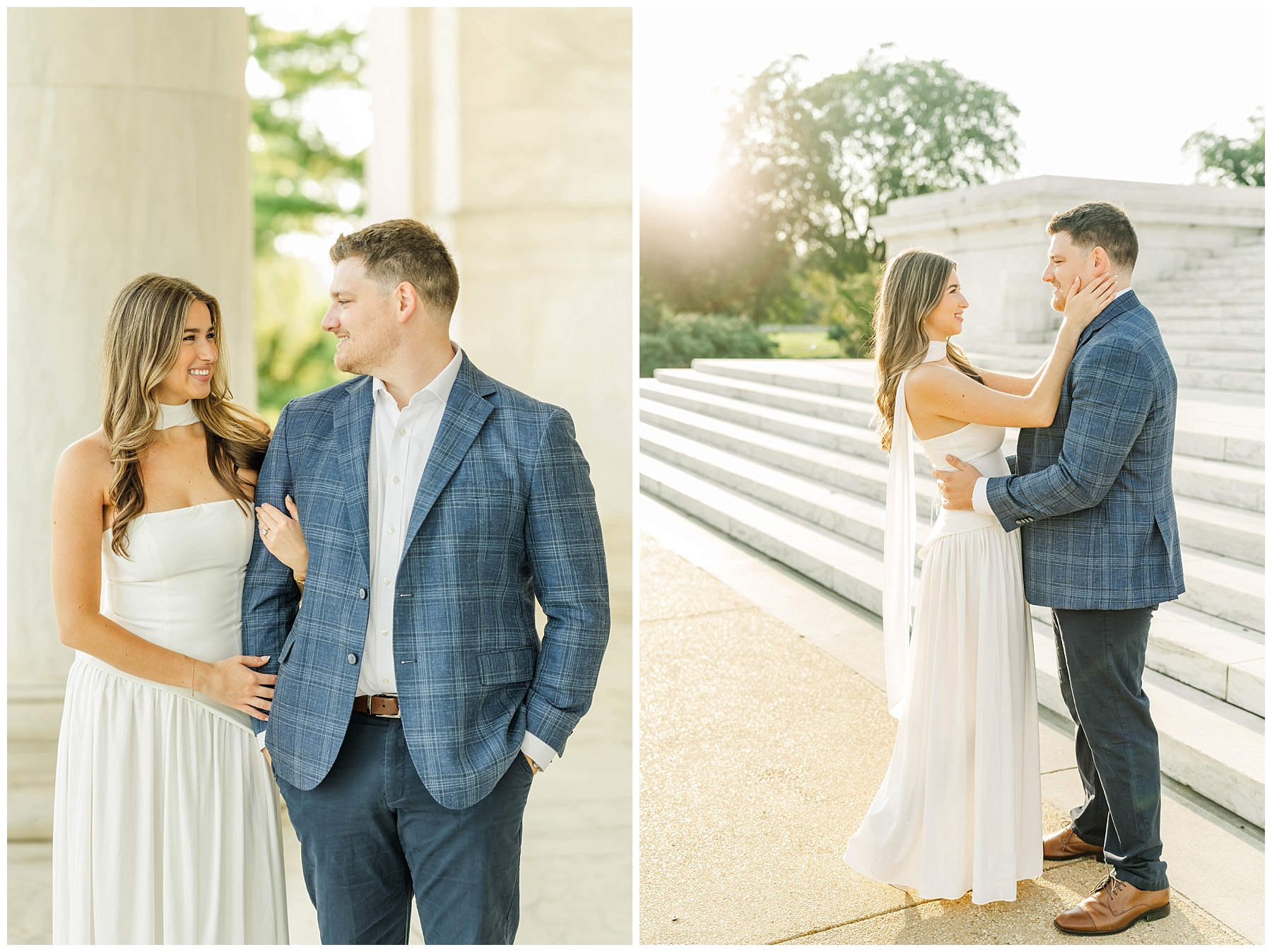 We met at sunrise to capture their engagement session among some of Washington, D.C.’s most iconic landmarks. The morning was stunning—the sky painted with soft pinks and oranges, the air calm and still. The light was perfect for artistic images, with sun pops shining through just at the right moments, wrapping Tyler and Meredith in a warm glow.